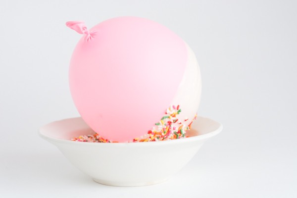 Balone operemo in osušimo. Nato jih napihnemo do želene velikosti in s peki papirjem zaščitimo delovno površino. Mrvice stresemo v skledo. Nato pripravimo glazuro. V posodi, na katero se prilega manjša skledica, zavremo za 5 prstov vode za vodno kopel. Posodico položimo nad soparo, potem pa vanjo nadrobimo čokolado. Dodamo še kokosovo maščobo, oboje pa med previdnim mešanjem počasi stopimo. Odstavimo in v glazuro pomočimo prvi balon. Nato ga pomočimo še v skledo z mrvicami. Pazimo, da balona ne vlečemo ampak ga pritiskamo na mrvice. Prekrit balon odložimo na peki papir in nadaljujemo z naslednjim balonom. Ko se glazura strdi, balone popokamo in nežno odstranimo. Barvite posodice napolnimo s sladoledom in uživamo.