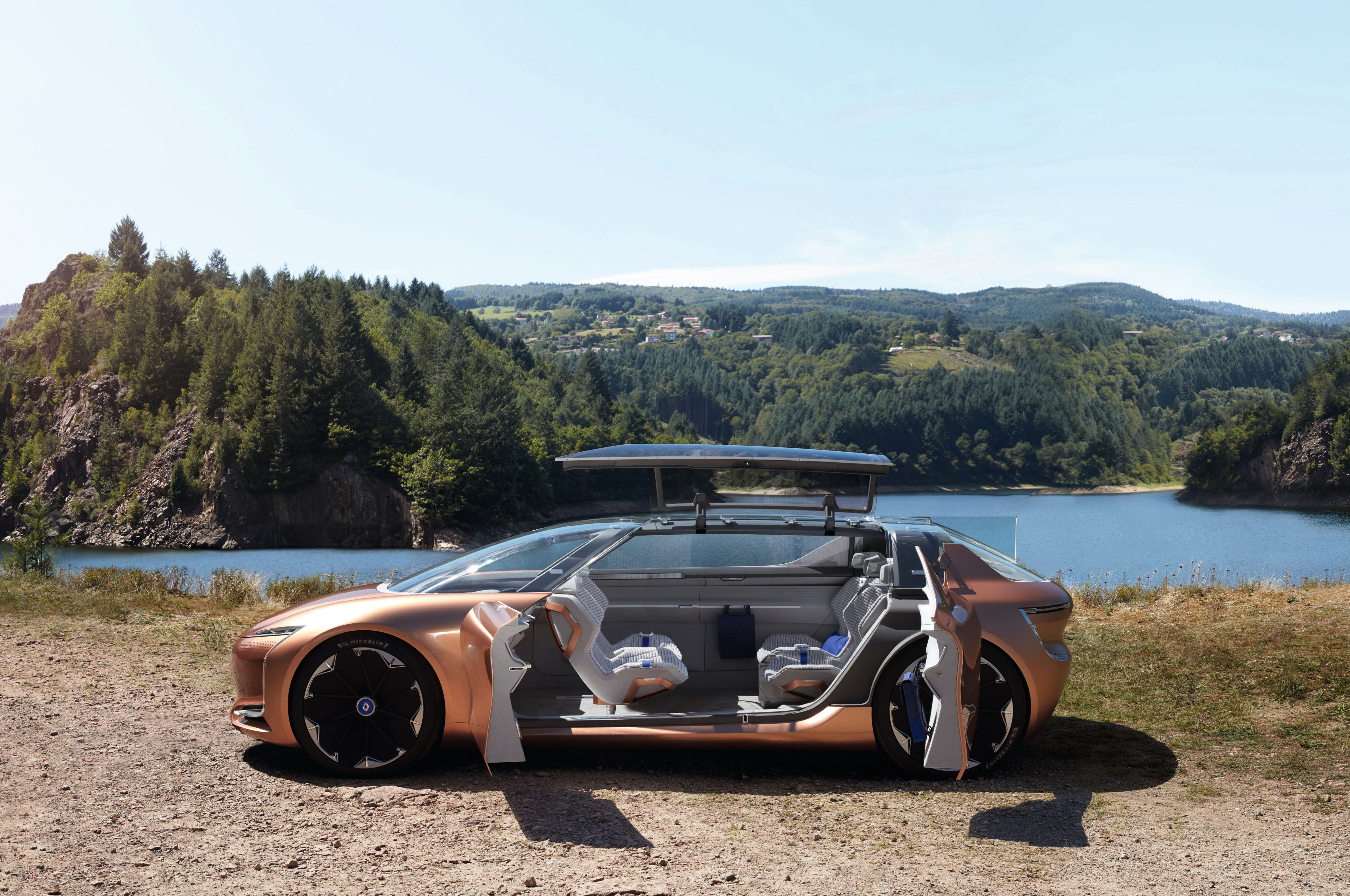Renault Simbioza to je povsem avtonomni avtomobil, v katerem se potniki počutijo maksimalno domaća izrada i opušten. Notranjost je oblikovana kot nekakšen prostor v hiši, z osrednjo mizo, okoli katere se lahko potniki sproščeno ukvarjajo drug z drugim ali se posvetijo svojemu delu. Symbioz ima zanimivo podolgovato obliko z nizko in ravno streho, z vseh strani pa ga obdaja kopica LED-svetil. Ker je avtomobil resnično pametan i autonomna, se ob vklopu funkcije Mind-off armaturna plošča samodejno pomakne nazaj od potnikov, da imajo ti več prostora za opuštanje. Računalnik bo tudi avtomatsko prepoznal potnike in tako vsakemu izmed njih prilagodil priljubljen položaj sedenja in najprijetnejšo temperaturo.