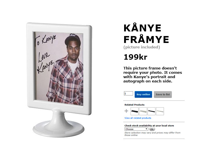 Za dobro vago pa je na splet dodala še okvir za sliko Kanye Framye in nekaj drugih norčavih predlogov pohištva, če bi sodelovanje kdaj zaživelo. Ogledate si jih lahko v nadaljevanju.