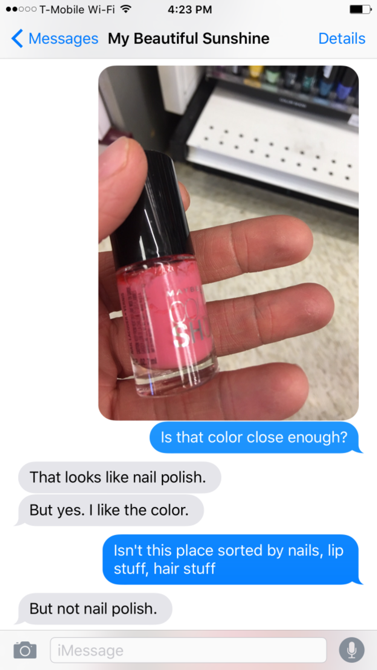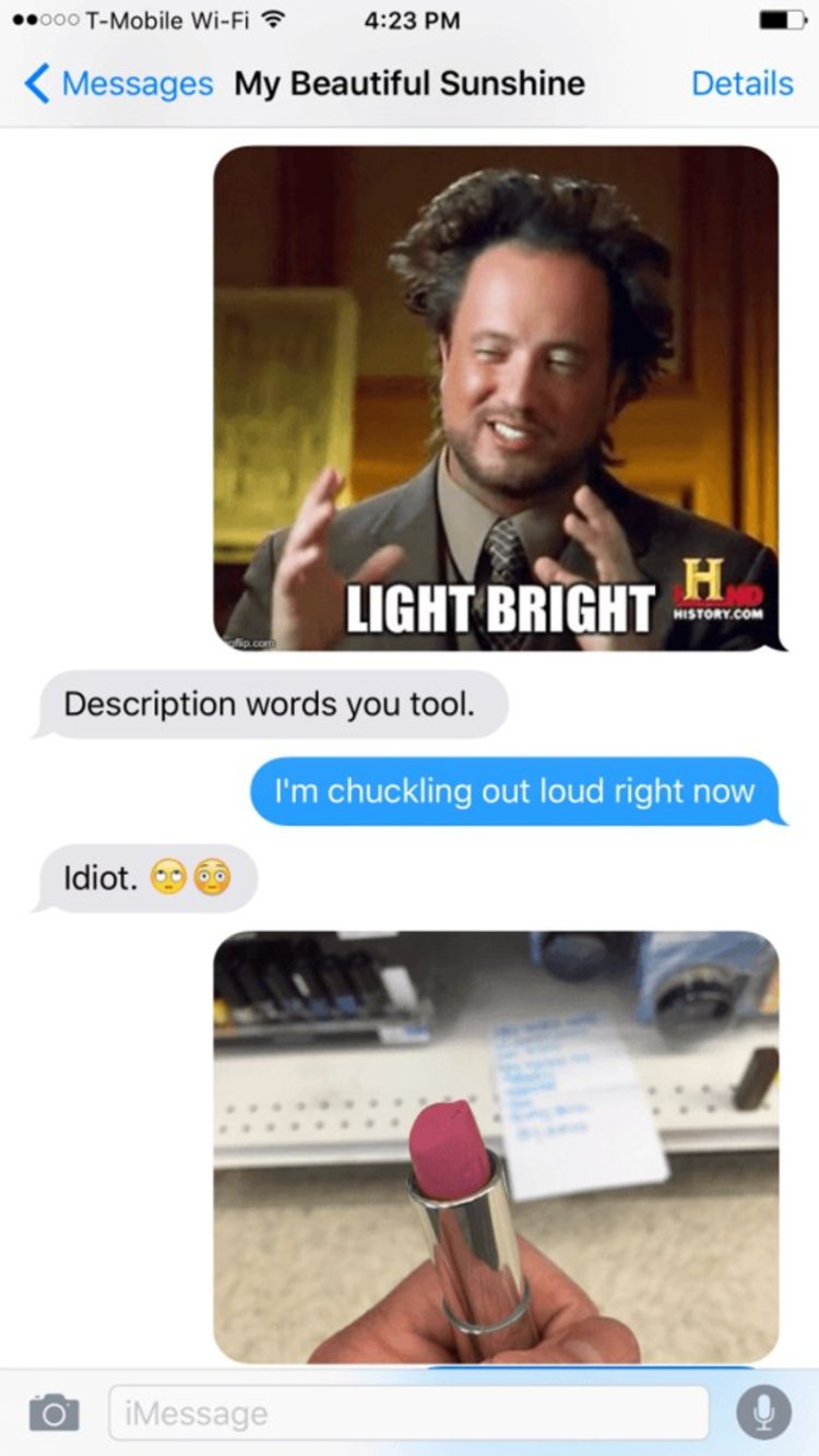 To je dokaz pogovor dekleta in njenega fanta (Imgurjevega uporabnika Bluefiz), ki se ponudi, da ji nakupi zalogo kozmetike in ličil, češ da bo nalogi kos, a kot se kmalu izkaže, ji še zdaleč ni dorasel. Smeh zagotovljen!