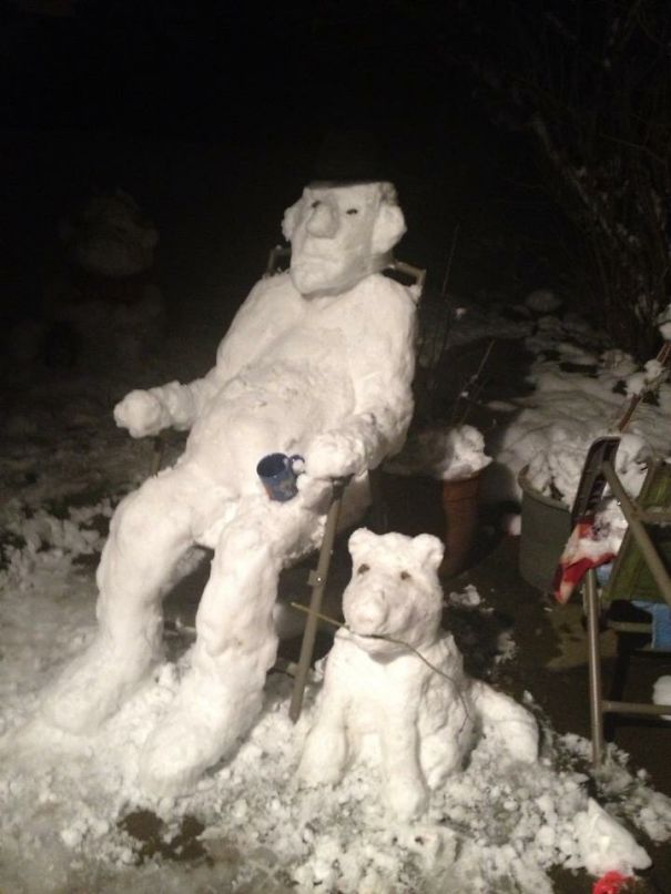 Snežne skulpture ustvarjajo ne samo otroci, tudi marsikdo z umetniško in kreativno žilico, ki na sneg ne gleda kot na nadlogo, jih. Kidanje je zanj kot prinašanje na kup umetniškega materiala, potrebnega za ustvarjanje, ne pa nebodigatreba pred odhodom v službo, sneg pa je mezzi di espressione. In tako nastanejo snežne skulpture, ki bi zlahka našle prostor tudi v galerijah, ne samo na prostem.