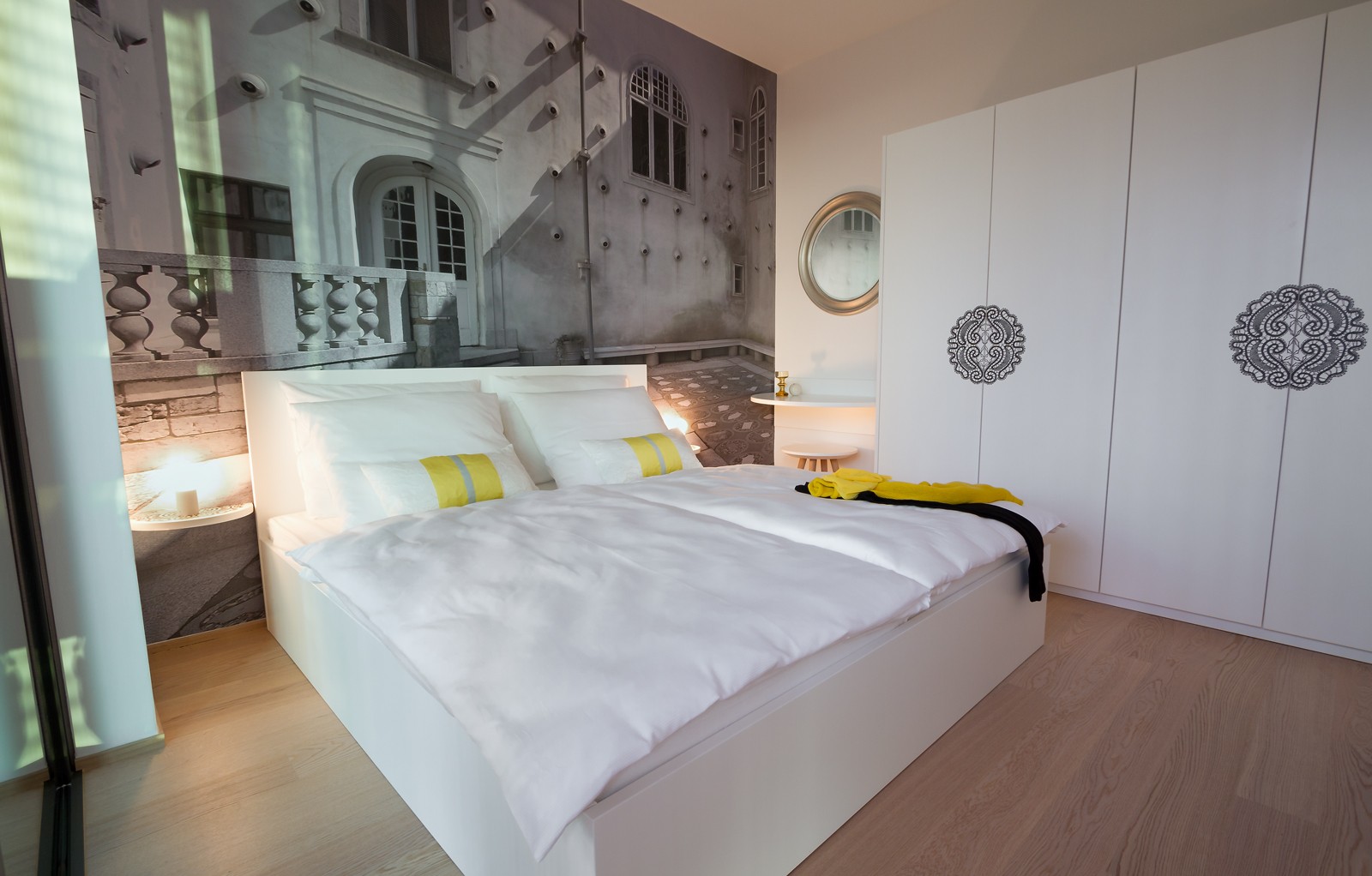 La zona giorno dell'appartamento è piuttosto piccola, quindi non volevano appesantirla con mobili pesanti. Invece, la cucina e il set di divani sono stati premuti contro il muro e nella stanza sono stati posizionati solo il tavolo da pranzo e le sedie che, grazie alla loro forma rotonda, hanno un effetto morbido e discreto. Lo spazio sembra luminoso, accenti colorati e aggiungono freschezza E giocosità. Tutti gli accessori tessili decorativi sono opera della designer Vesna Javornik. L'attrazione principale della sala è però senza dubbio la stampa del soffitto, che indica la posizione geografica del complesso della Situla e segna i principali collegamenti ferroviari del Paese e delle principali città. Questo grafico dà ai visitatori un senso generale dello spazio del nostro paese e facilita il loro orientamento iniziale. L'appartamento vanta anche ampio balcone, su cui i visitatori possono rilassarsi e godersi il panorama.