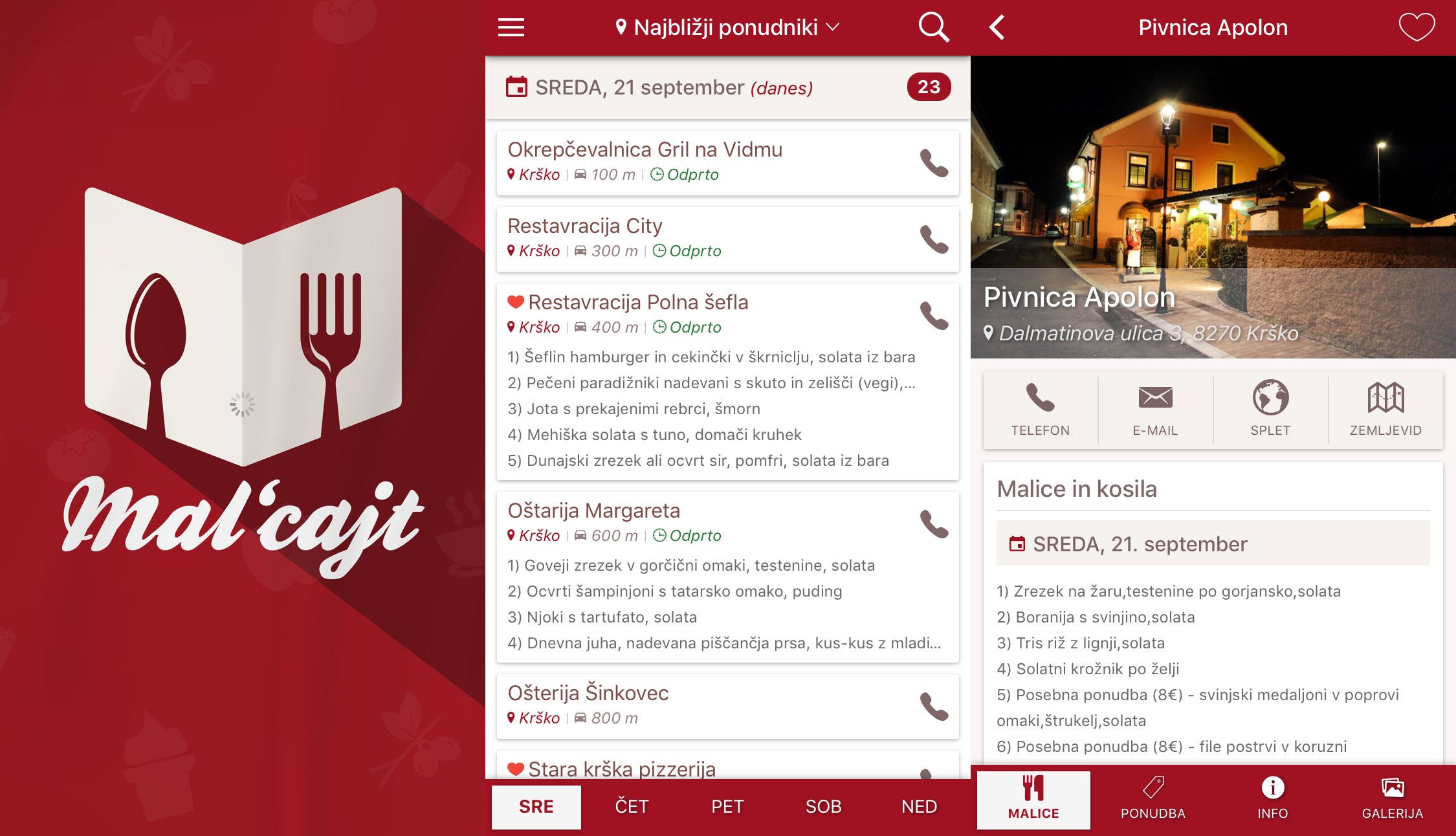 Malcaite è nuovo Applicazione mobile slovena, che tornerà utile a tutti coloro che mangiano spesso fuori casa e non ne hanno idea, dove fare colazione, pranzo o cena. Quando si fa clic sul provider, questi vengono visualizzati descrizione dettagliata, orari di lavoro, offerta permanente e attuale e informazioni di contattoe sono allegate anche le foto. Con un clic puoi chiamare il ristorante selezionato o trovarlo sulla mappa. La malcaite è unica nel suo genere elenco dei fornitori di ristorazione sloveni.