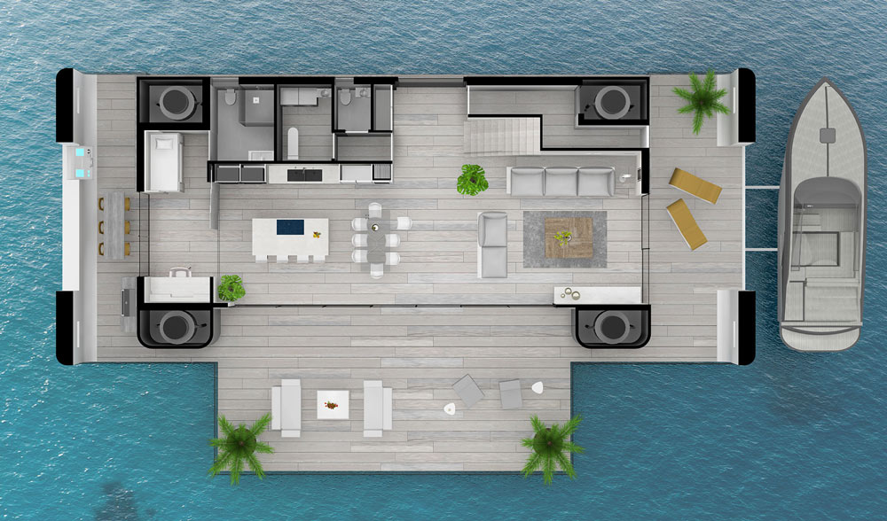 Ma queste non sono le caratteristiche più sorprendenti di Arkup. Si stanno nascondendo quattro carri idraulici, che sono annegate in colonne di sostegno nel mare e sono in grado di sollevare l'intera struttura ben 12 metri sopra la superficie, Se l'acqua allagherebbe. Alimentato da casa o da yacht motore con 272 cavalli, pannelli solari sul tetto e si assicurano che la fornitura di energia elettrica sia rispettosa dell'ambiente.