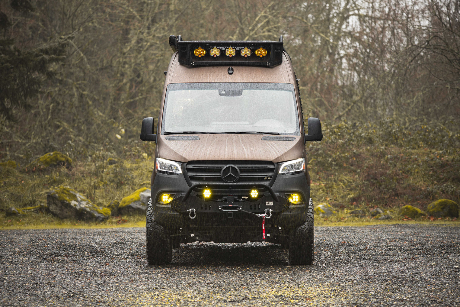 Una scala funzionale corre lungo i lati del veicolo e conduce a uno spazioso portapacchi dotato di diverse luci Baja Designs che illuminano il tuo campo o la superficie di lavoro con una potenza simile alla luce del giorno. Il portapacchi non è solo pratico per il trasporto di attrezzature aggiuntive, ma funge anche da piattaforma di osservazione dalla quale è possibile godersi le notti stellate o la vista mattutina.