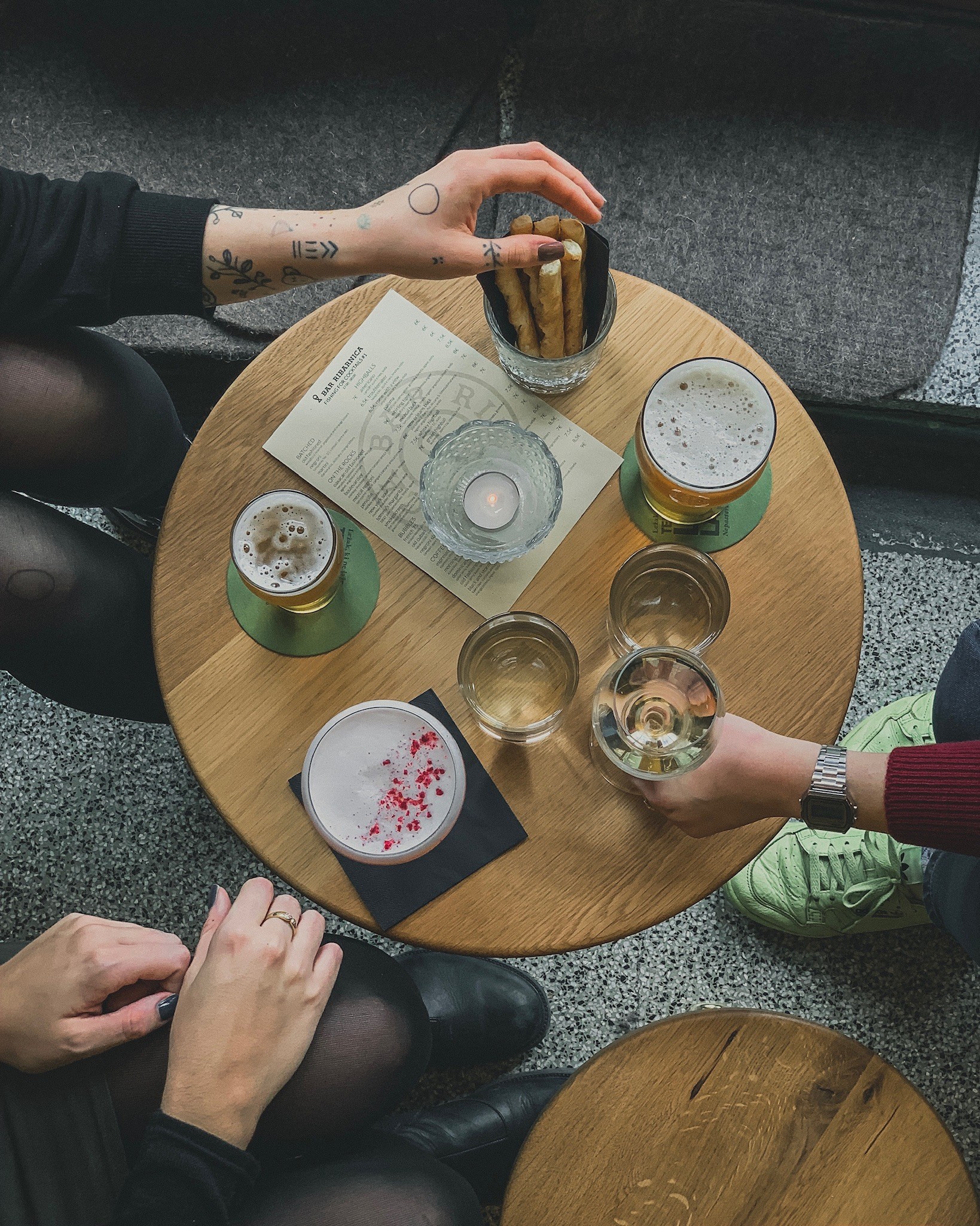 A Ribarnica vogliono muoversi con i cocktail nella direzione di cocktail artigianali con ingredienti selezionati di qualità. È così che fanno i loro sciroppi o sciroppi e li creano anche loro stessi ghiaccio per cocktail (ti chiaro ghiaccio), che sono tagliati a mano da blocchi di ghiaccio più grandi ed è trasparente come il vetro grazie a uno speciale processo di lavorazione.