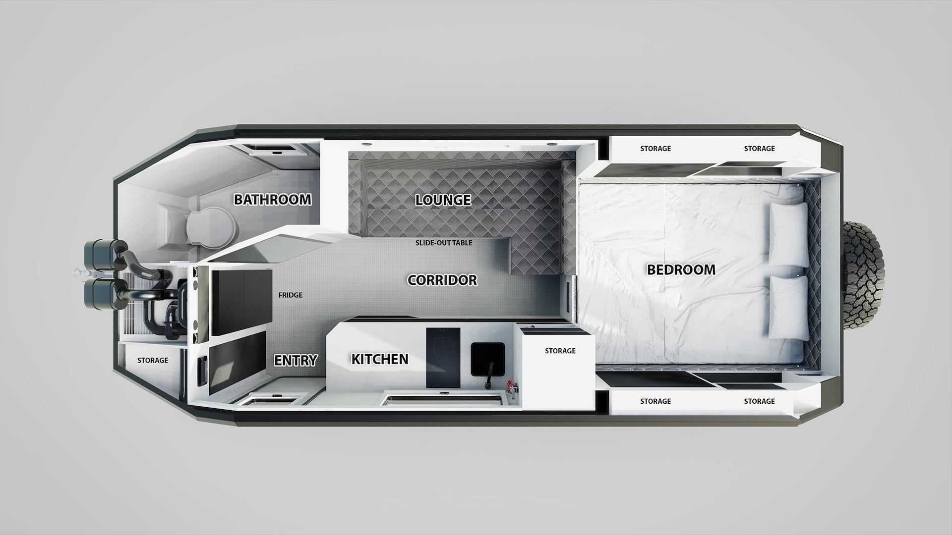 Una centrale solare è disponibile per la sopravvivenza nella natura selvaggia 1.600 watt e la capacità della batteria 1.000 amperora. Oltre alla fornitura di energia elettrica, abbiamo a disposizione anche un sistema di filtraggio dell'acqua, che ci permetterà di rimanere tagliati fuori dal mondo per periodi di tempo più lunghi. I pneumatici di diametro enorme facilitano gli spostamenti sul terreno 37 pollici E verricello, che ci farà uscire da molti dilemmi del terreno. Il rimorchio offre una porta aggiuntiva, attraverso la quale entreremo più velocemente all'interno del rimorchio o accederemo ancora più velocemente all'area del bagno. Se ti piace goderti la pace e la natura o semplicemente vuoi nasconderti dal mondo, il trailer d'avventura Bruder EXP-8 sarà perfetto per te.