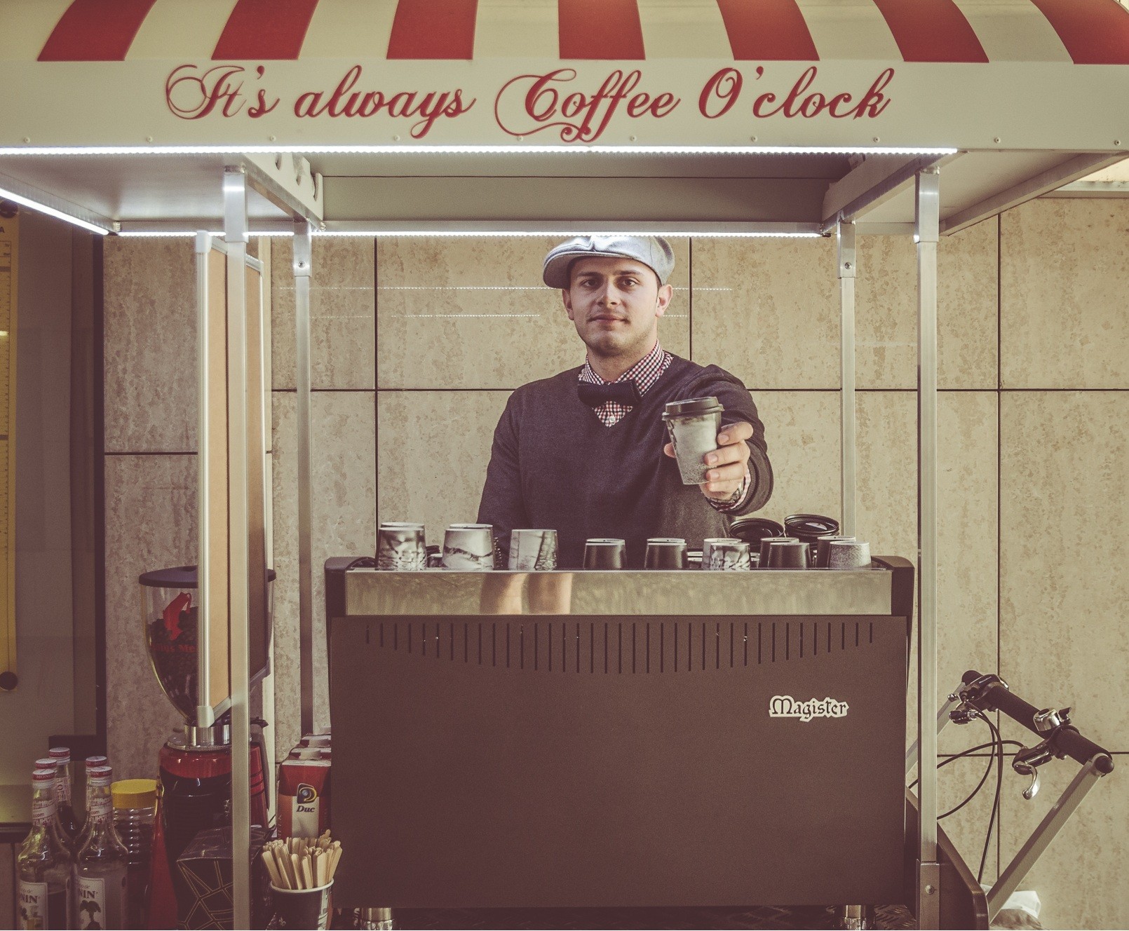 Caffè da portar via L'ora del caffè durante la corsa costante da un punto all'altro, ci offre una tregua di qualità e ci mette, almeno per un momento, nel presente. L'ora del caffè incanta con un nostalgico concetto di strada vendite di tricicli e offre un meraviglioso tocco personale, poiché il venditore di caffè prepara il caffè secondo i nostri gusti con un sorriso e auguri. L'odore seducente che si diffonde dal vaso dal bel design e il gusto inebriante che accompagna ogni sorso del liquido vellutato ci metteranno sicuramente in uno stato di pace e piacere, almeno per un po'. Coffee O'Clock è un team di appassionati amanti del caffè spinti dal desiderio di riempire ogni angolo delle strade cittadine con l'odore del caffè appena macinato. Dai loro tricicli ci servono allegramente espresso, macchiato, cappuccino, caffè con latte, latte macchiato (caffè bianco) e caffè aromatizzato (irlandese, vaniglia francese, cocco, cioccolato, nocciola, caramello).