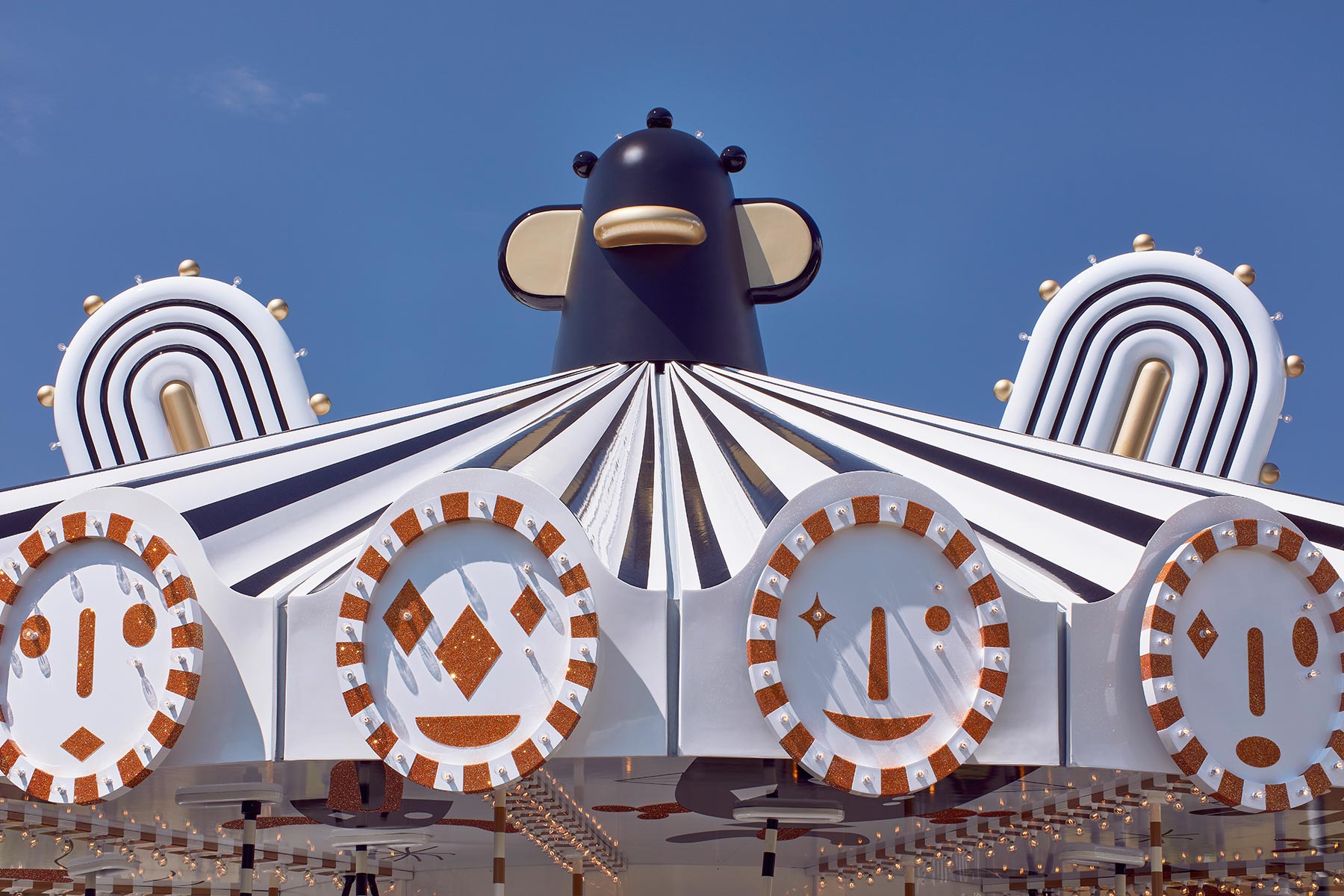 L'artista voleva incantare con il suo lavoro una sensazione di libertà e gioia, cosa che senza dubbio è riuscita a fare. Ha trovato l'ispirazione per la creazione nel mondo delle fiabe e di conseguenza ha dotato la giostra creature immaginarie, che fungono da sedili. Un'intera specie può essere vista sul tetto e sulla recinzione facce buffe, che brillano al sole.