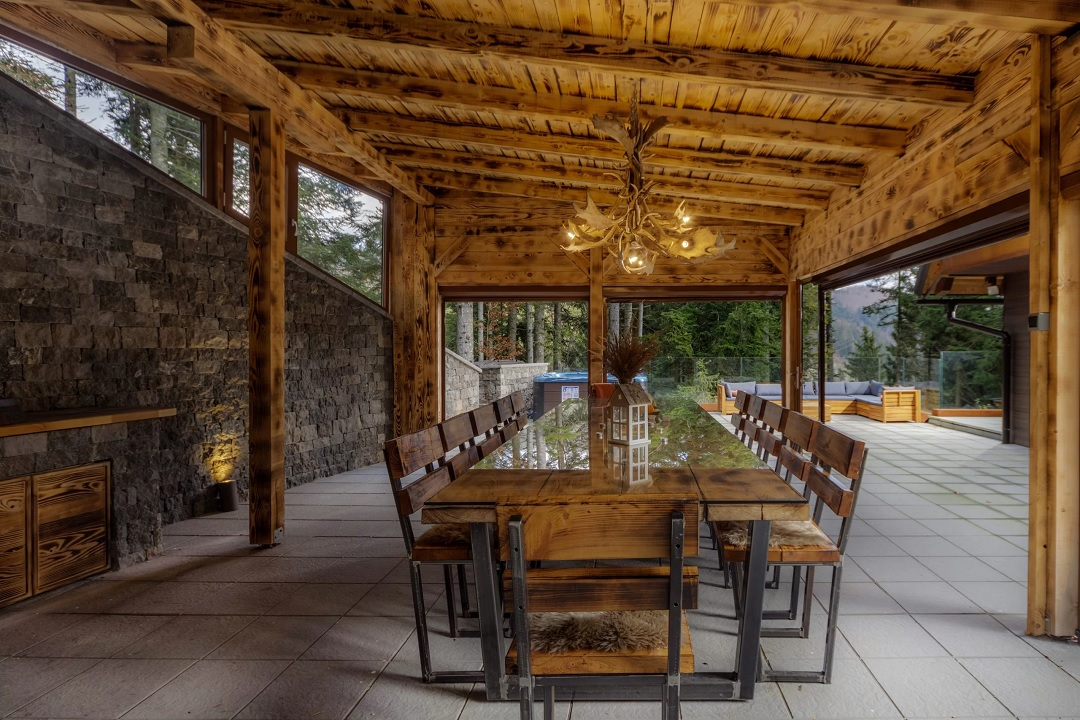 Il soggiorno, la sala da pranzo e la cucina sono collegati da un open space dominato da un camino che vi terrà al caldo nelle fredde giornate e notti invernali. I bagni e il centro benessere dispongono di riscaldamento a pavimento. Oltre agli interni belli ed eleganti, rimarrai particolarmente affascinato dalle grandi pareti di vetro, che ti permettono di goderti la vista da quasi ogni angolo. una splendida vista della foresta, che circonda la casa.