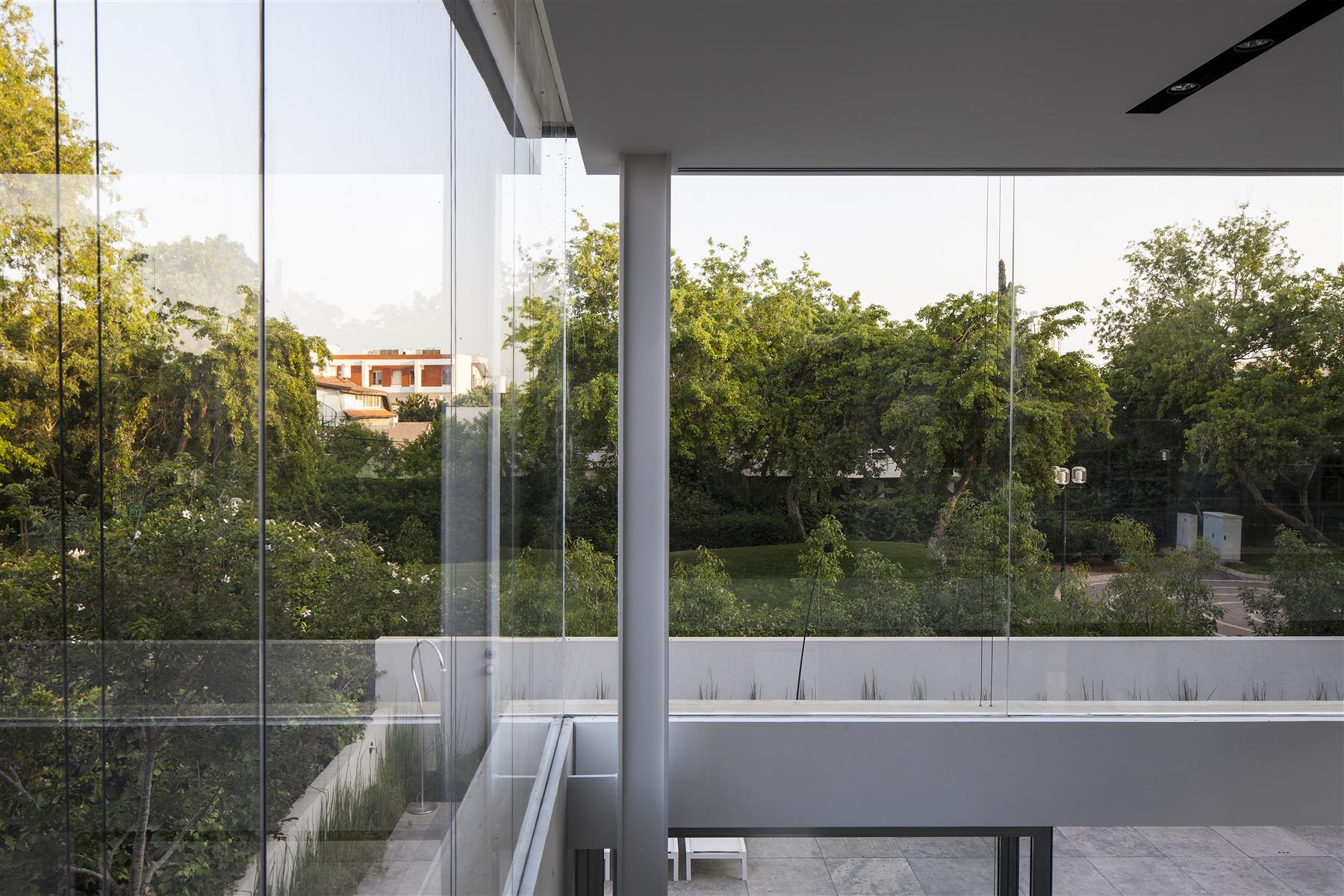 Kombinacija steklo-beton ponuja različne stopnje zasebnosti, kajti medtem ko na južni strani ta dvonadstropna hiša igra ”nudista”, je na severni čisti ”zapetež”. Pred dnevnim prostorom in tik za panoramskimi drsnimi stenami se bohoti čudovit piscina all'aperto, v zgornji etaži pa najdemo spalnice in kabinet. V zgornje nadstropje vodijo ”javne” stopnice, ki jih pospremijo stekleni paneli, zažrti v beton, vsi prostori pa so od glave do pet oblečeni v minimalizem. Barvitost v monokromatsko vzdušje vnašajo notranje rastline in posamezni pohištveni elementi, strogi minimalizem pa mehča tudi zelena zunanja okolica.
