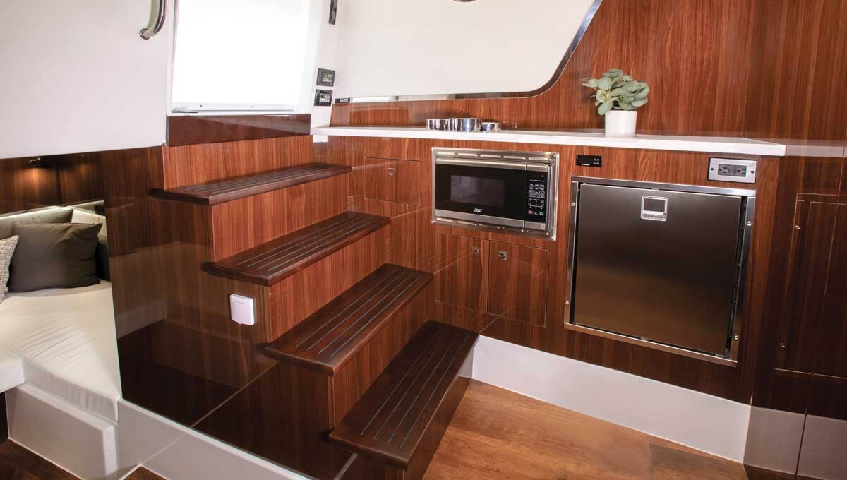 Quando entri Yacht da crociera 50 GLS, ti sentirai come se fossi entrato in un mondo di lusso ed eleganza. L'interno è come un hotel galleggiante a cinque stelle. Ogni angolo è attentamente progettato per offrire il massimo del comfort e della funzionalità. L'ampio salone con sedili in morbida pelle e accenti contemporanei è perfetto per serate rilassanti in buona compagnia. Al centro del salone c'è un grande televisore ultra HD, completamente integrato con un sistema audio premium, che consente un'esperienza cinematografica in mezzo all'oceano. Dotata della tecnologia più recente, tra cui un piano cottura a induzione, un moderno frigorifero e una macchina da caffè all'avanguardia, la cucina offre tutto il necessario per preparare piatti gourmet. Una camera da letto con un ampio letto, biancheria da letto lussuosa e un televisore integrato promette notti tranquille, mentre il dolce dondolio delle onde ti trasporta in un mondo di sogni. Ogni dettaglio, dall'illuminazione alla scelta dei materiali, è pensato per creare un'atmosfera di lusso e familiarità difficile da trovare altrove.