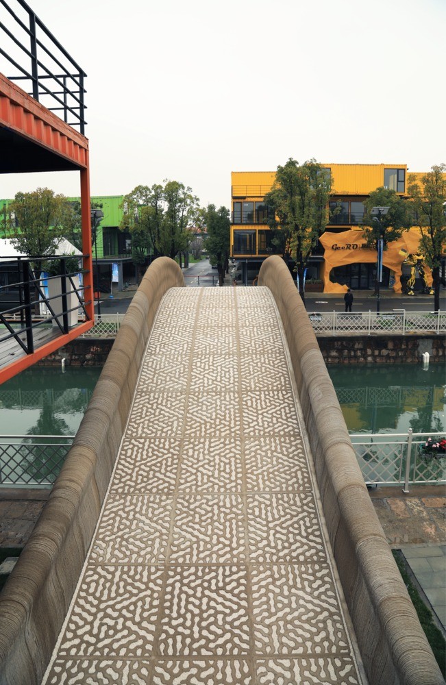 Il più grande ponte di cemento stampato in 3D al mondo, destinato ai pedoni, sta in cinese Shangai. Il team dietro il progetto JCDA sotto la guida di un professore Xu Weiguo con Scuola di Architettura dell'Università Tsinghua, un centro di ricerca per l'architettura digitale Terra Zoina e una società di investimento Baia della Saggezza di Shanghai.