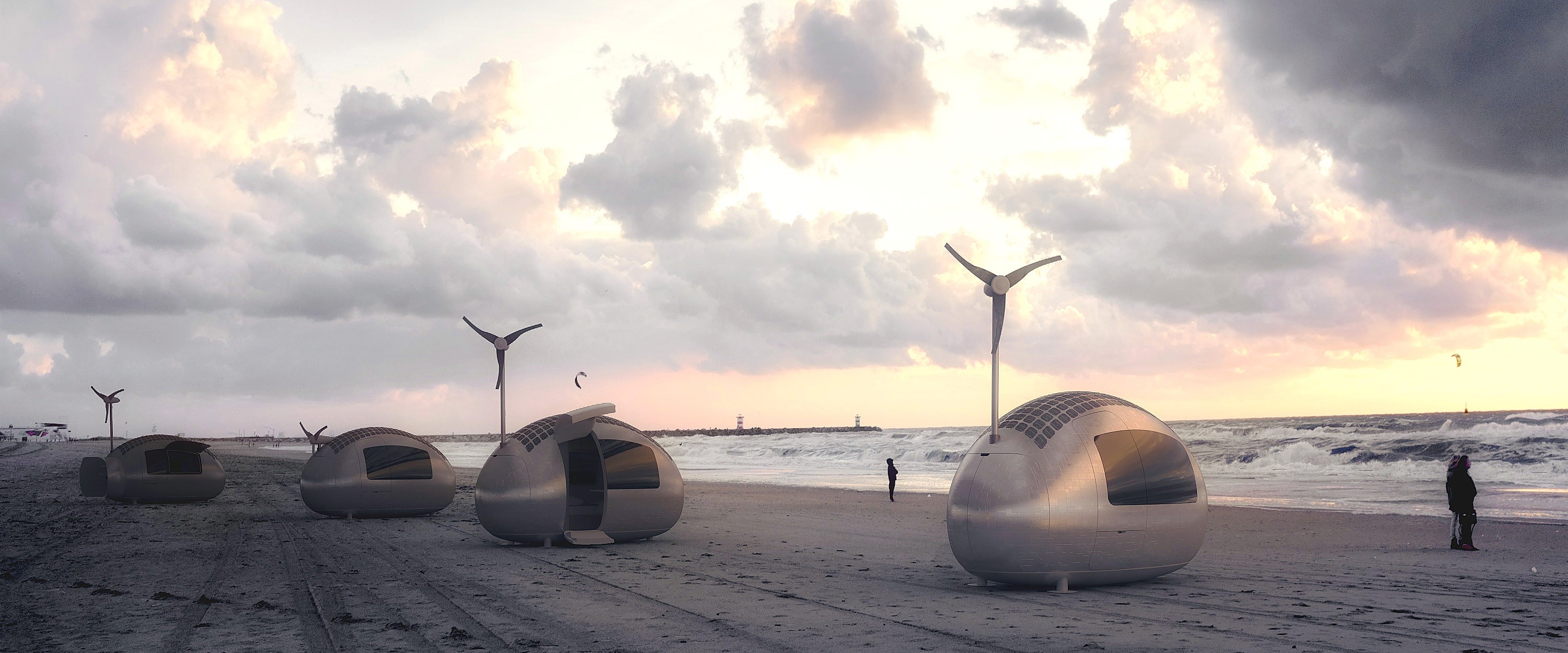 Ecocapsule è una casa mobile autosufficiente dal design futuristico dello studio di Bratislava Nice Architects, che offre un soggiorno fuori dalla rete fino a un anno. Ogni unità è dotata di pannelli solari e di una turbina eolica e progettata per catturare l'acqua piovana. L'interno è dotato di angolo cottura con acqua corrente e doccia calda.