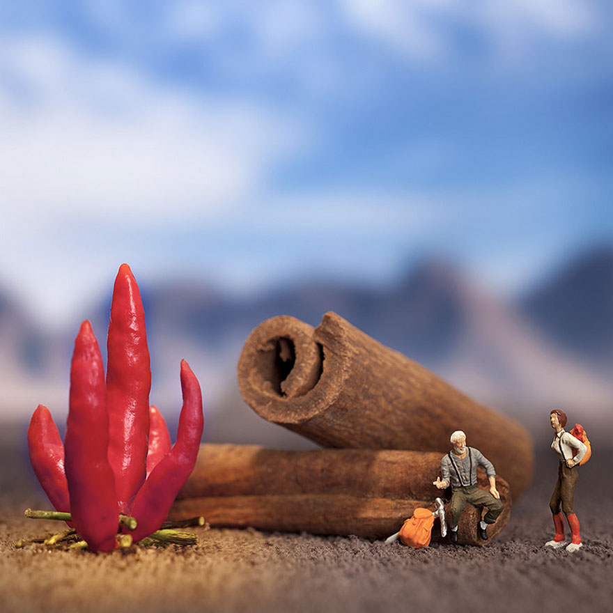 Za nekatere je ustvarjanje v kuhinji nekaj vsakdanjega in avtomatičnega. Kdo drug je nad kulinaričnim udejstvovanjem tako zelo navdušen, da v kuhanju najde priložnost za umetniško ustvarjanje. Igranje s hrano je tokrat doživelo nove razsežnosti, saj so sočni sadeži, hrustljava zelenjava in slastne testenine navdušile brazilskega umetnika Williama Kassa v tolikšni meri, da je iz njih ustvaril pravcati nadrealni svet. V seriji z naslovom “Minimize-Food” je namreč miniaturne človeške figurice postavil v svet, ki ga je sestavil iz hrane. Sadje, zelenjava, testenine, sladoled in še kaj v seriji fotografij sestavljajo odlično kuliso in prav posebno scenografijo. Še en dokaz, da je z nekaj domišljije možno vse!