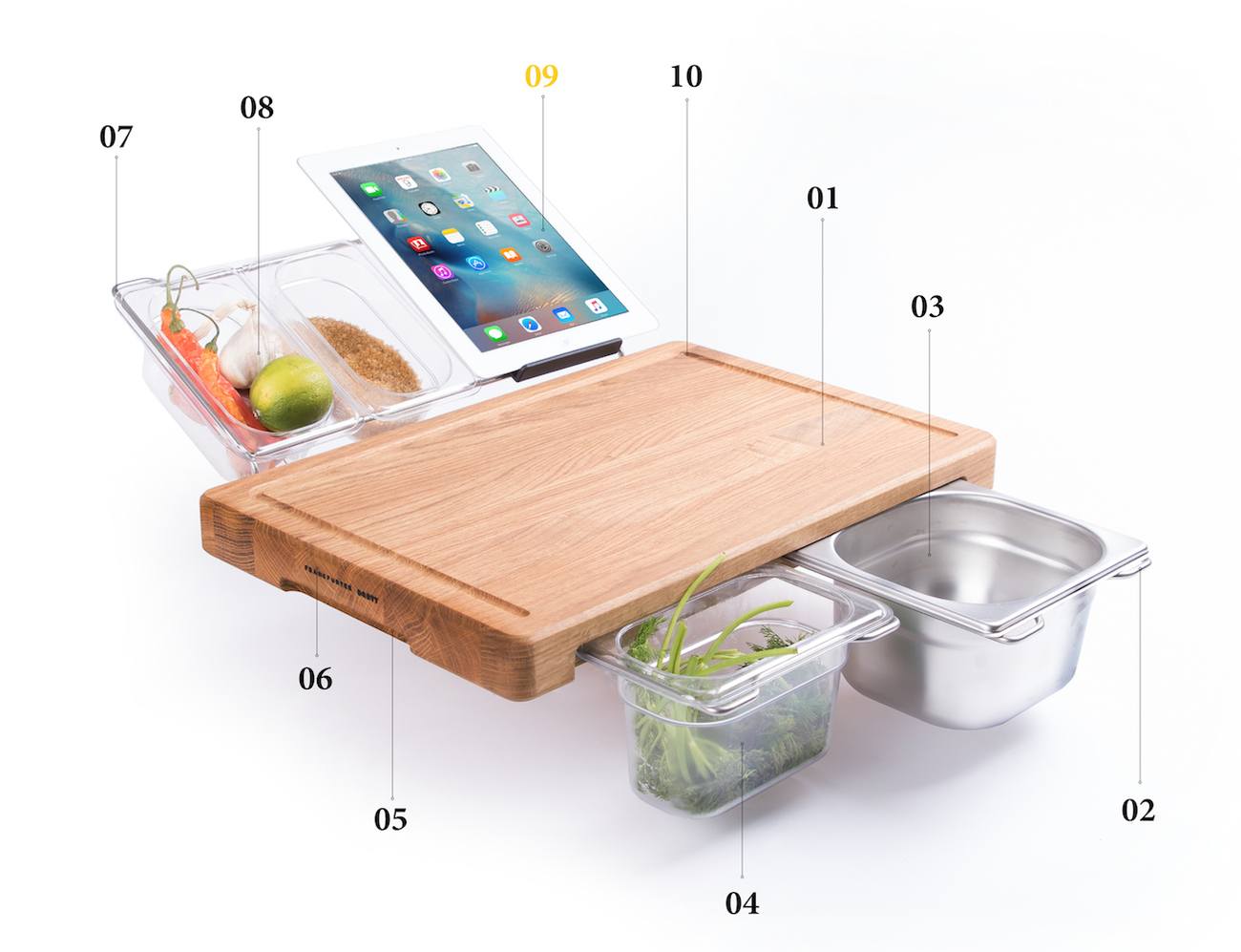 Na eni strani deske lahko izvlečemo dve držali za vpetje posodic, eno namenjeno hrani, drugo odpadkom. Deska je dovolj velika, da jo lahko razdelimo na delovni in odlagalni del. Na drugi strani skriva držala, ki se postavijo pod kotom, namenjena držanju kuharske knjige, tablice iPad in posodic za sestavine, do katerih imamo posledično lažji dostop. Osnovi set ci sarai tu su Kickstarter olajšal za 119 euro.