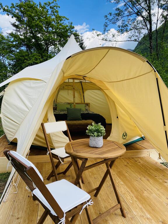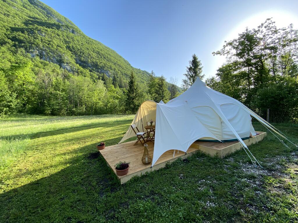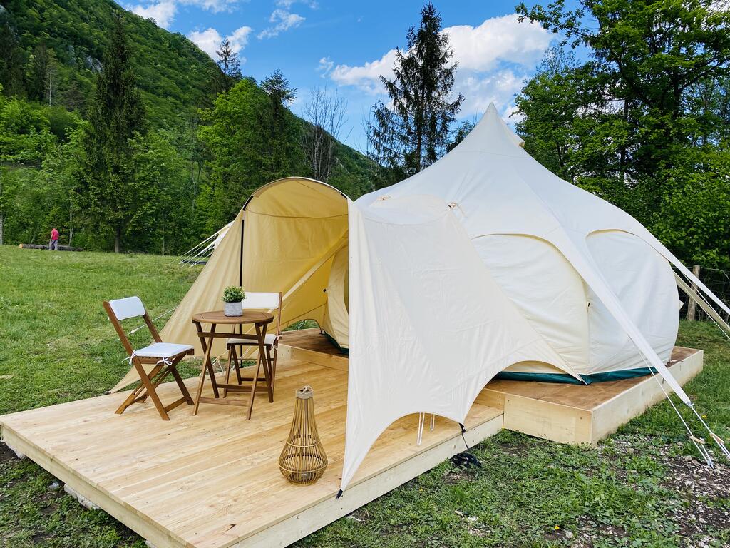 Glamping Gozdna Jasa, che dista solo cinque chilometri dal centro di Bovac, è il primo glamping con tende Lotus Belle in Slovenia. Ci sono attualmente cinque disponibili sulla proprietà. Queste sono tende estremamente ben costruite resistente all'acqua, al fuoco, alla muffa, può sopravvivere a forti venti e hanno alta protezione dai raggi UV. Offrono alloggi tranquilli e privati nel mezzo di un prato circondato da boschi, montagne e il fiume Soča, e puoi anche campeggiare nella proprietà con propria attrezzatura.