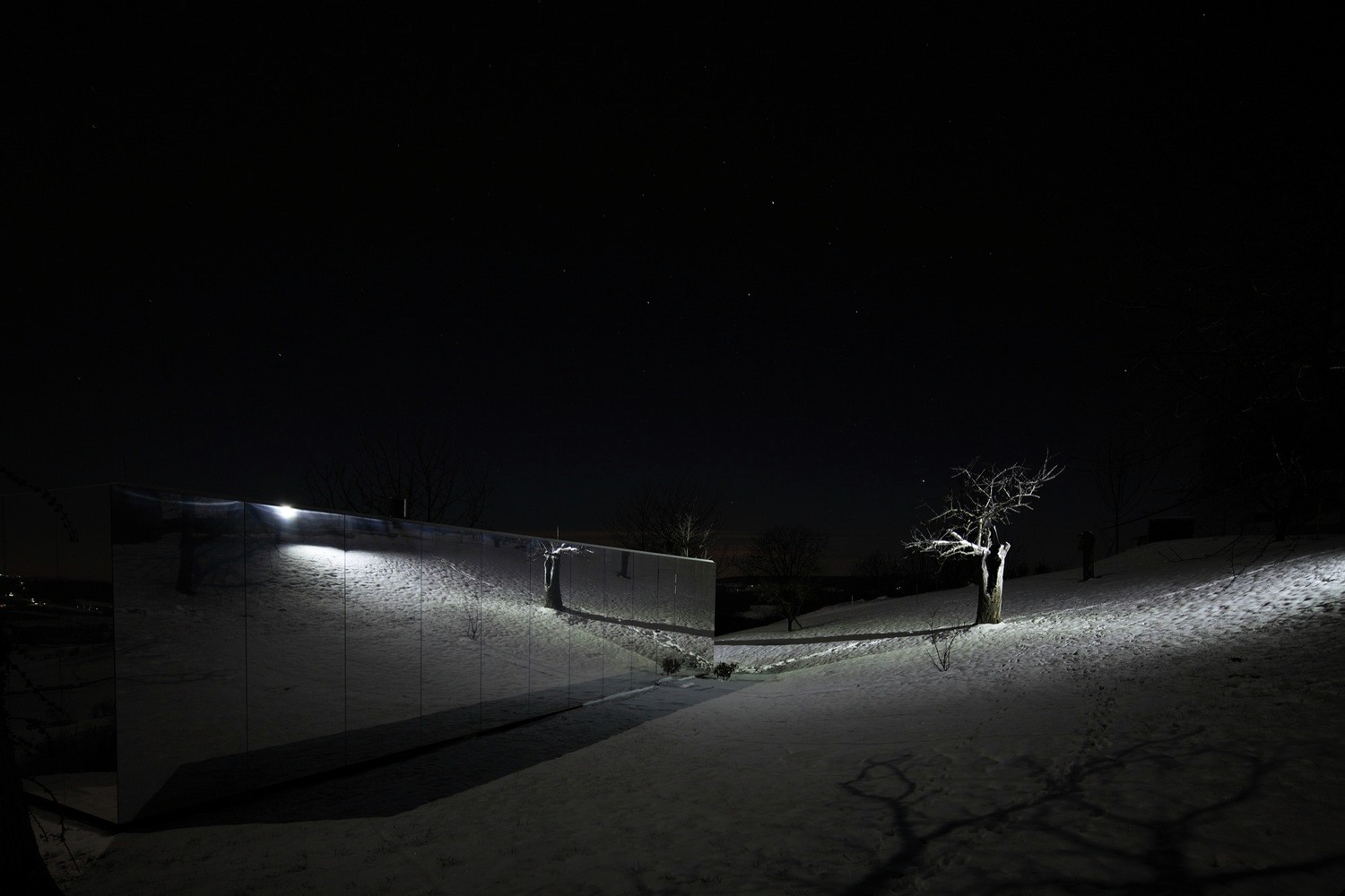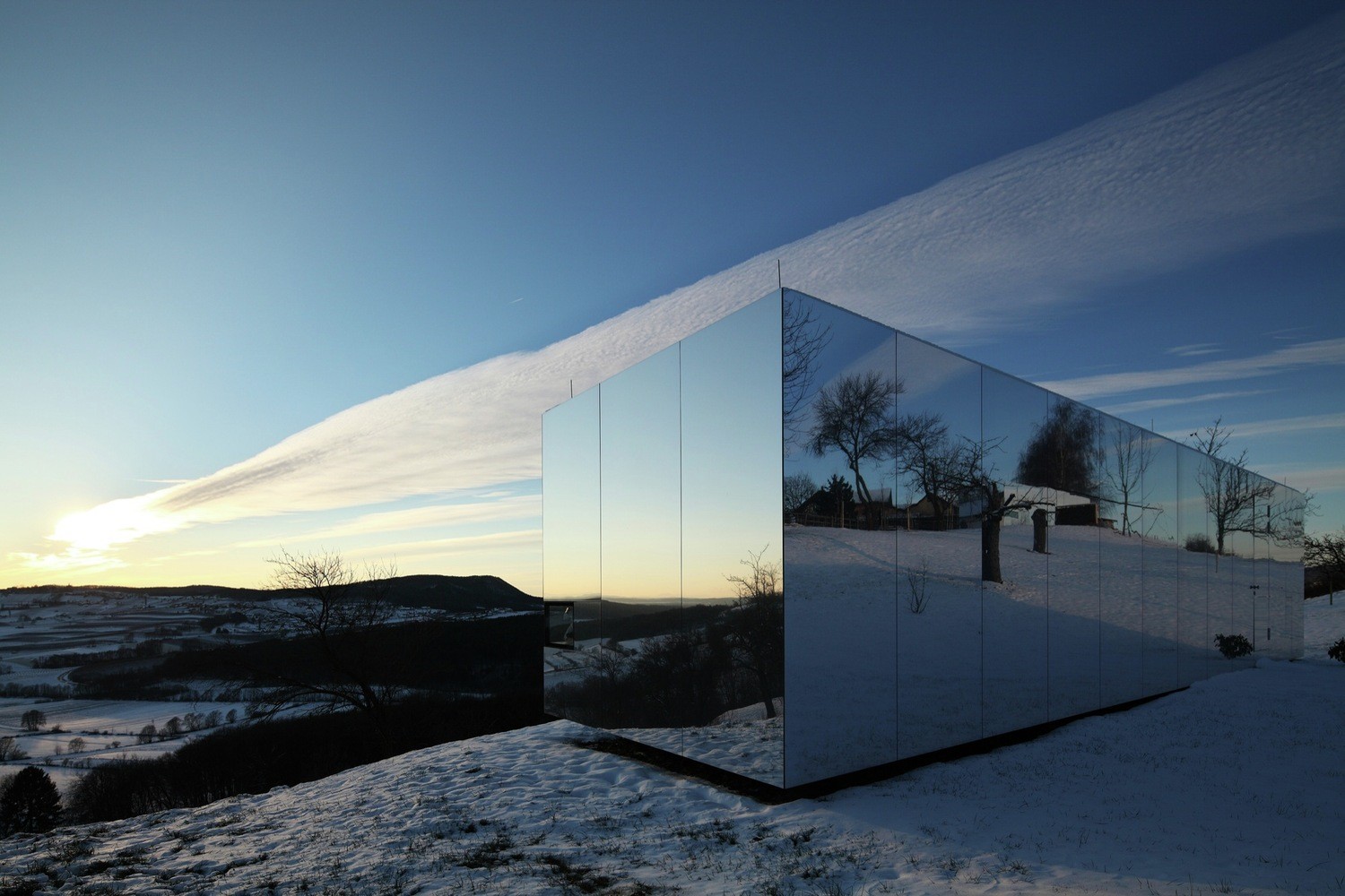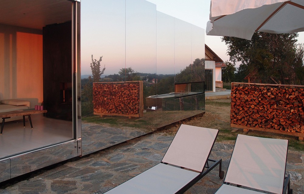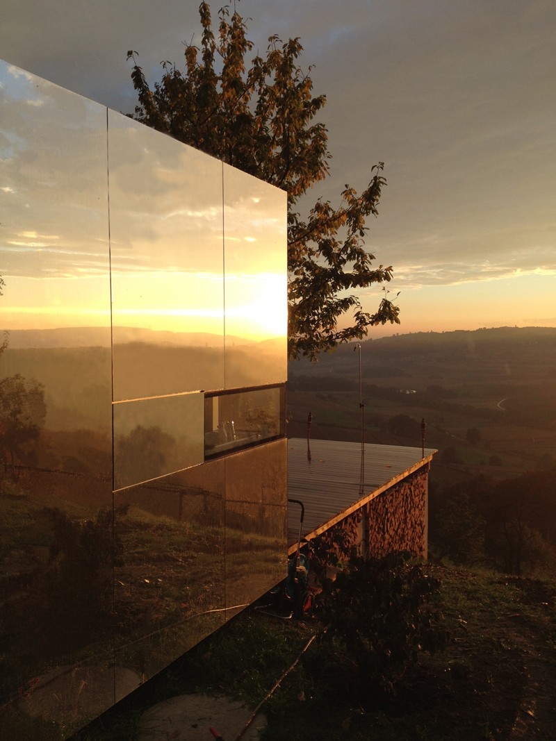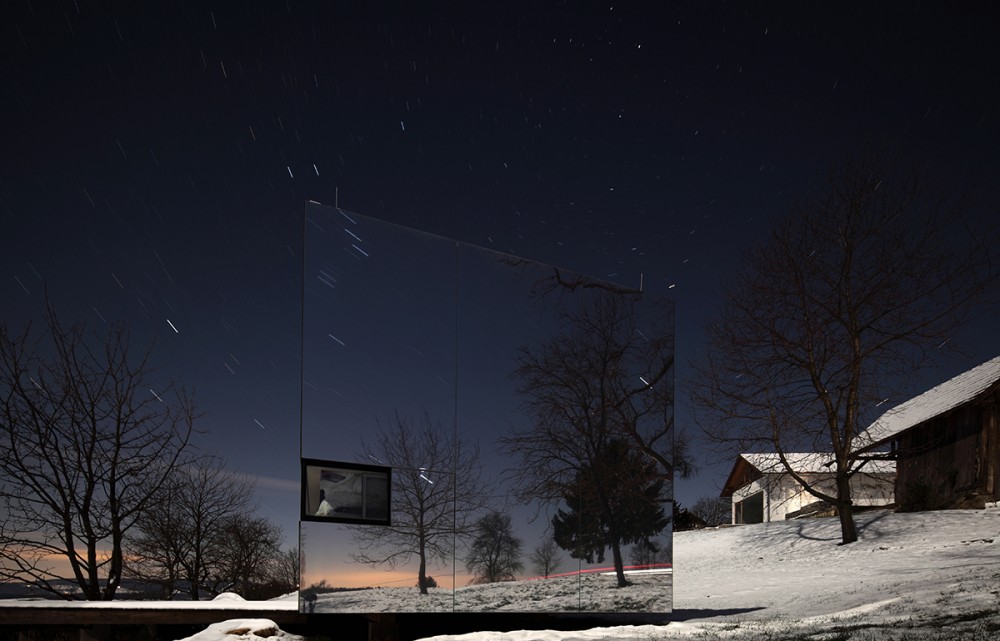 Casa Invisibile rispettivamente casa invisibile è un prototipo pratico di abitazione modulare e due sono stati costruiti di recente nel PrekmurjeUn'unità mobile copre un'area di 14,5 x 3,5 metri ed è quasi al 100 percento fatto di legno, che può essere riciclato. Non richiede l'installazione di alcun macchinario, solo un grande camion che lo consegna direttamente dalla fabbrica a te ovunque tu sia, perché non ha praticamente alcuna restrizione sul posizionamentoÈ vestita con un mantello dell'invisibilità, poiché è adornata con facciata a specchioNon piega la luce in modo che non colpisca la casa, ma la sua immagine cambia in un modo unico, oppure si mimetizza con l'ambiente circostanteDa qui il suo nome, poiché si mimetizza perfettamente con lo spazio in cui viene collocato. A volte è un tramonto, altre volte un cielo azzurro, e una terza volta nasconde l'universo.