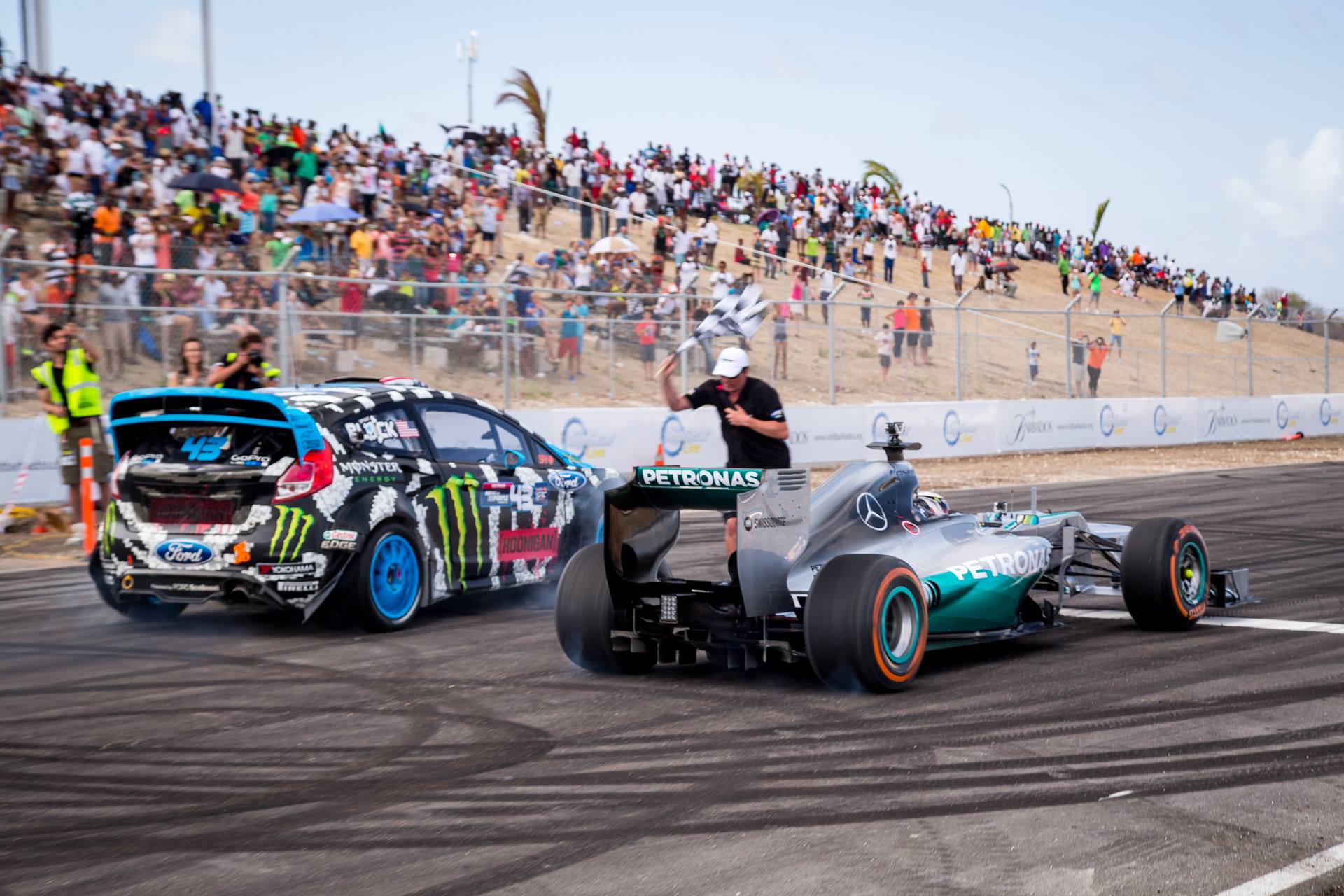 Ken Block – svetovni prvak v rallycross in vselej tisti, ki na Youtube v sodelovanju s sponzorji vselej pripravi najbolj nore video posnetke avtomobilističnih vragolij, tokrat izzove svetovnega prvaka Lewisa Hamiltona in njegov bolid F1. Dogodek se je odvijal v okviru “Top Gear Live” dogodkov v Barbadosu na progi, ki je bila prilagojena tako za eno kot drugo vozilo. Zaradi specifične konfiguracije se je zdelo, da je Ken Block za trenutek že videl epsko zmago. Vendar v tej tekmi niso določili uradnega zmagovalca. Ostaja le odličen video!
