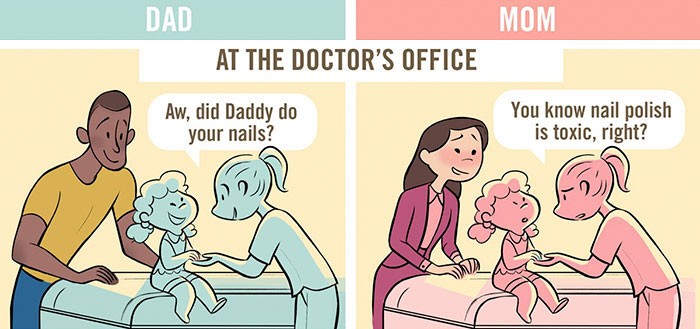 Gli esseri umani possono essere davvero crudeli. Quando vediamo un bambino piccolo nel parco con suo padre, ci sciogliemo tutti, quando la madre è lì e notiamo che sta fissando lo schermo del telefono, già la accusiamo mentalmente di quanto sia cattiva madre. Questo non è l’unico caso in cui usiamo manganelli diversi per madri e padri quando giudichiamo in pubblico le loro azioni genitoriali. Dai un'occhiata alle illustrazioni comiche di Chaunie Brusia, che contengono più di un semplice briciolo di verità. Mostrano come le persone giudicano in pubblico le madri e i padri in modo diverso e ingiusto quando hanno i loro figli piccoli a loro carico.