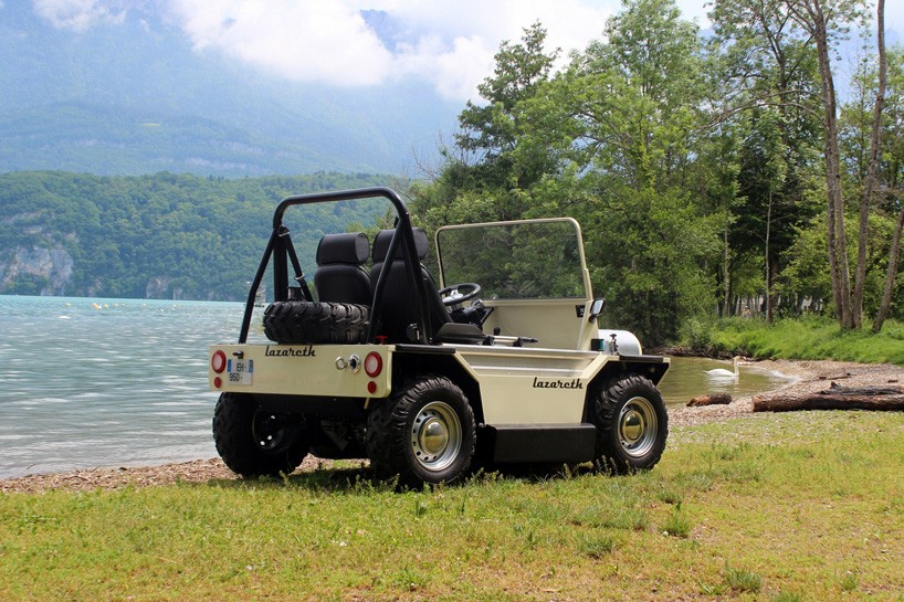 Veicolo anfibio Moke prodotto dall'azienda Lazaret, che ha già parecchie macchine modificate o uniche sotto il suo nome. L'ultimo prodotto è interessante dal punto di vista che può essere guidato su strada e un attimo dopo gira nel mare o nel lago. Sulla terra Motore da 400 cc unità Farina A 90 chilometri all'ora, v conduce e alla velocità 7 nodi (12,9 km/h).