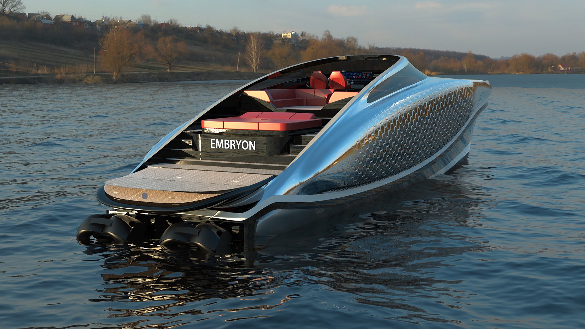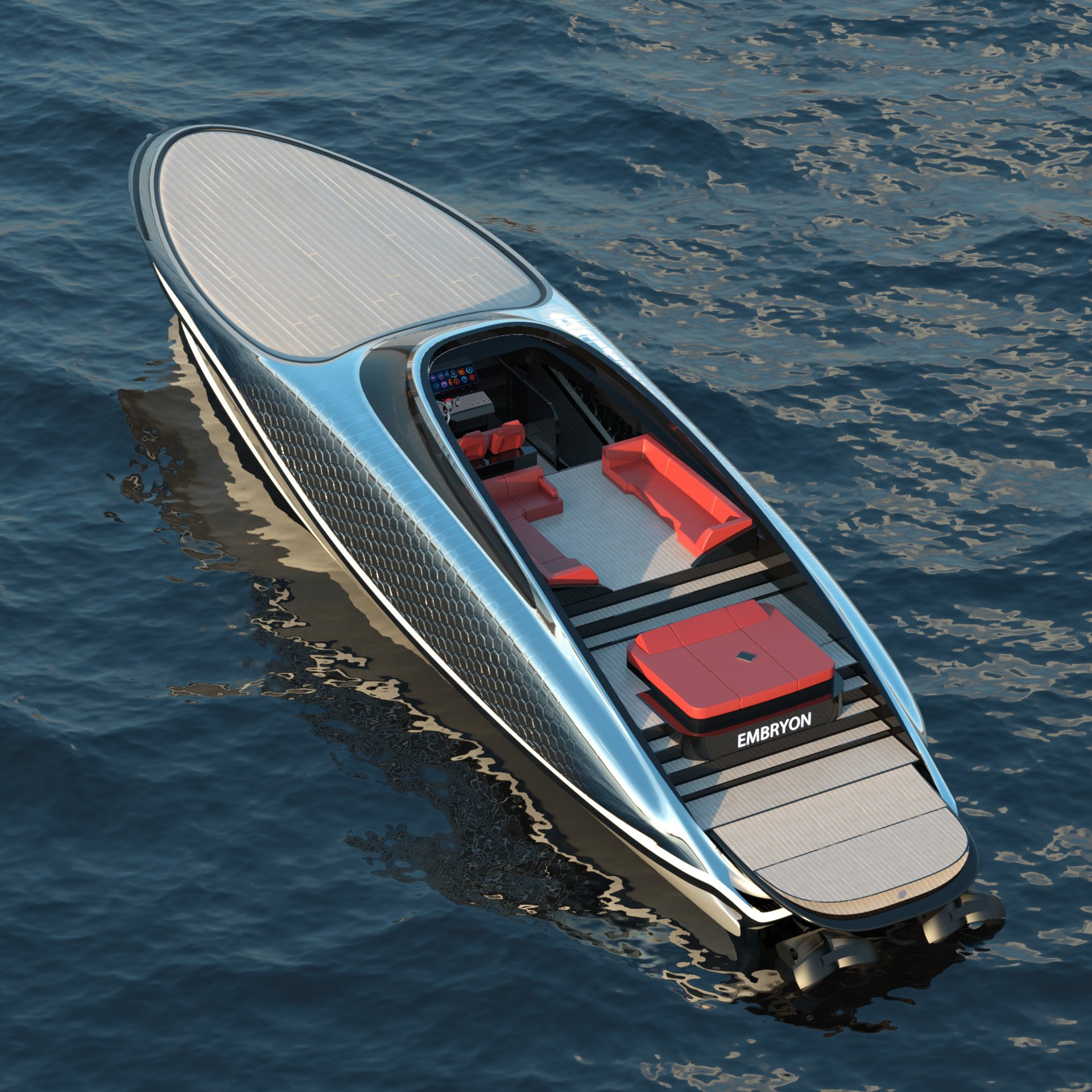 Il vantaggio di Embryon è nella scelta dei materiali che sono per Accendino 30%, rispetto alle tradizionali tecniche di costruzione delle navi. Alla Lazzarini sei come un drive for 24 metri lungo Embryon, immaginano un sistema di propulsione a idrogeno, o un sistema ibrido composto da due cilindri MAN V-12 e un motore elettrico. La spinta dovrebbe essere abbastanza forte da consentire all'Embryon di "fluttuare" a velocità 65 nodi.