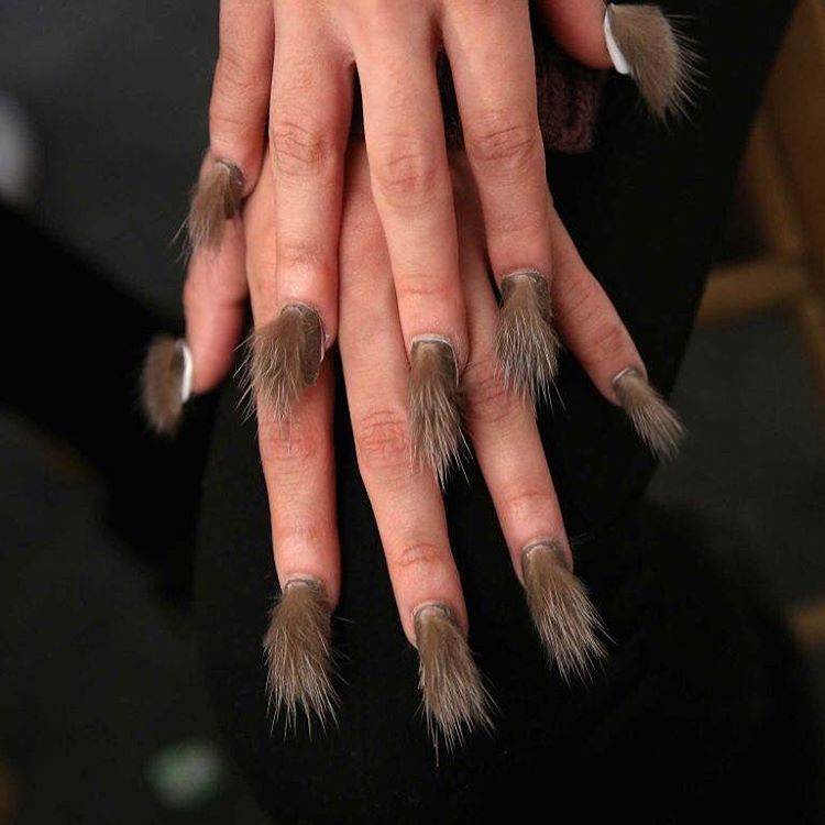 Kosmati nohti so pogruntavščina znamke Libertine. Nov bizarni tendenza di bellezza je debitiral na newyorškem tednu mode. Ne gre za umetne nohte, za videz kosmatih nohtov morate na nohte najprej nanesti podlak, nato želeno barvo (najbolje takšno, ki se ujema z barvo krzna), ko je lak še moker, pa dodate pelliccia artificiale. Seveda pa lahko tudi eksperimentirate kot nekatera dekleta v spodnji fotogaleriji.