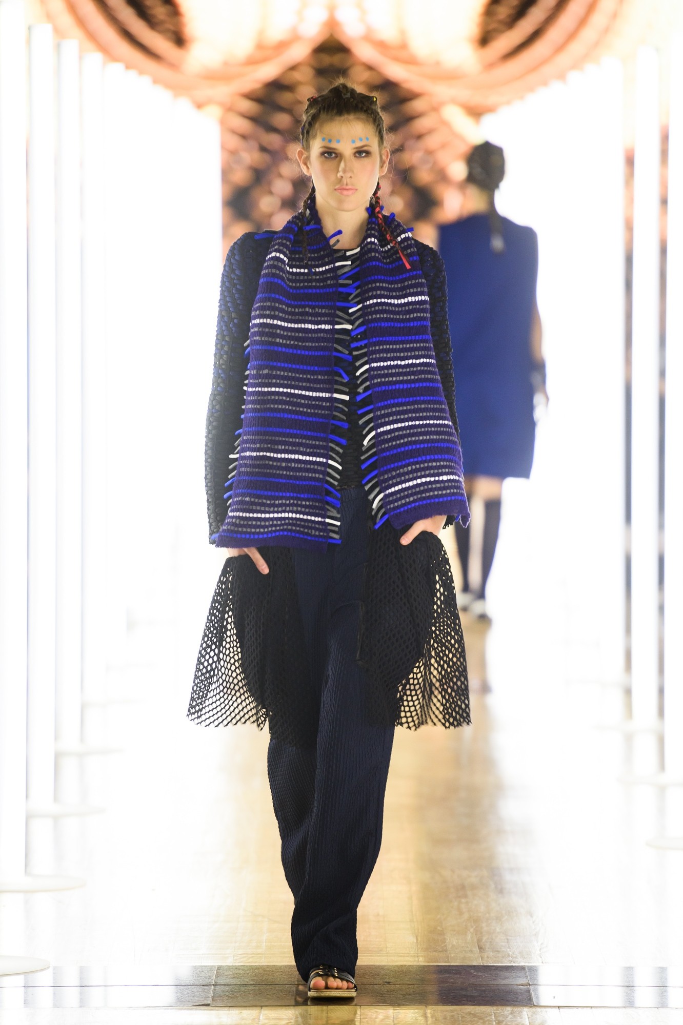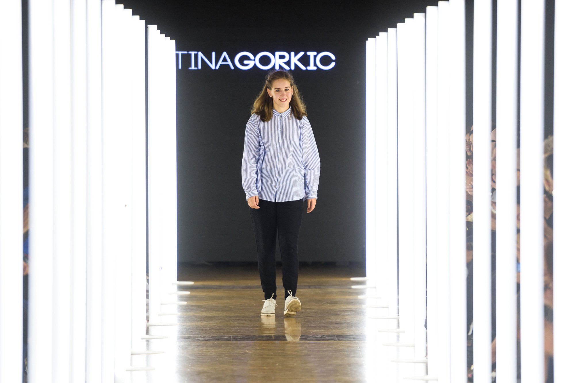 "Aisha. Donna, vita, essere vivi. La collezione Aisha si concentra sulle donne africane e sulle loro battaglie quotidiane per la parità di genere. Il punto di partenza fondamentale è la questione dell'identità e della posizione delle donne in Africa e la loro affermazione di fronte al genere maschile. La ricerca di significato e simboli mi ha portato a combinare diversi colori, motivi e texture, con una forte enfasi sui materiali. La collezione è più orientata al design tessile." Come studentessa presso la Facoltà di Scienze e Tecnologia di Lubiana, Tina Gorkič ha vinto il premio di presentazione alla successiva settimana della moda, la LJFW di aprile, quindi questa volta si è presentata con una collezione indipendente.