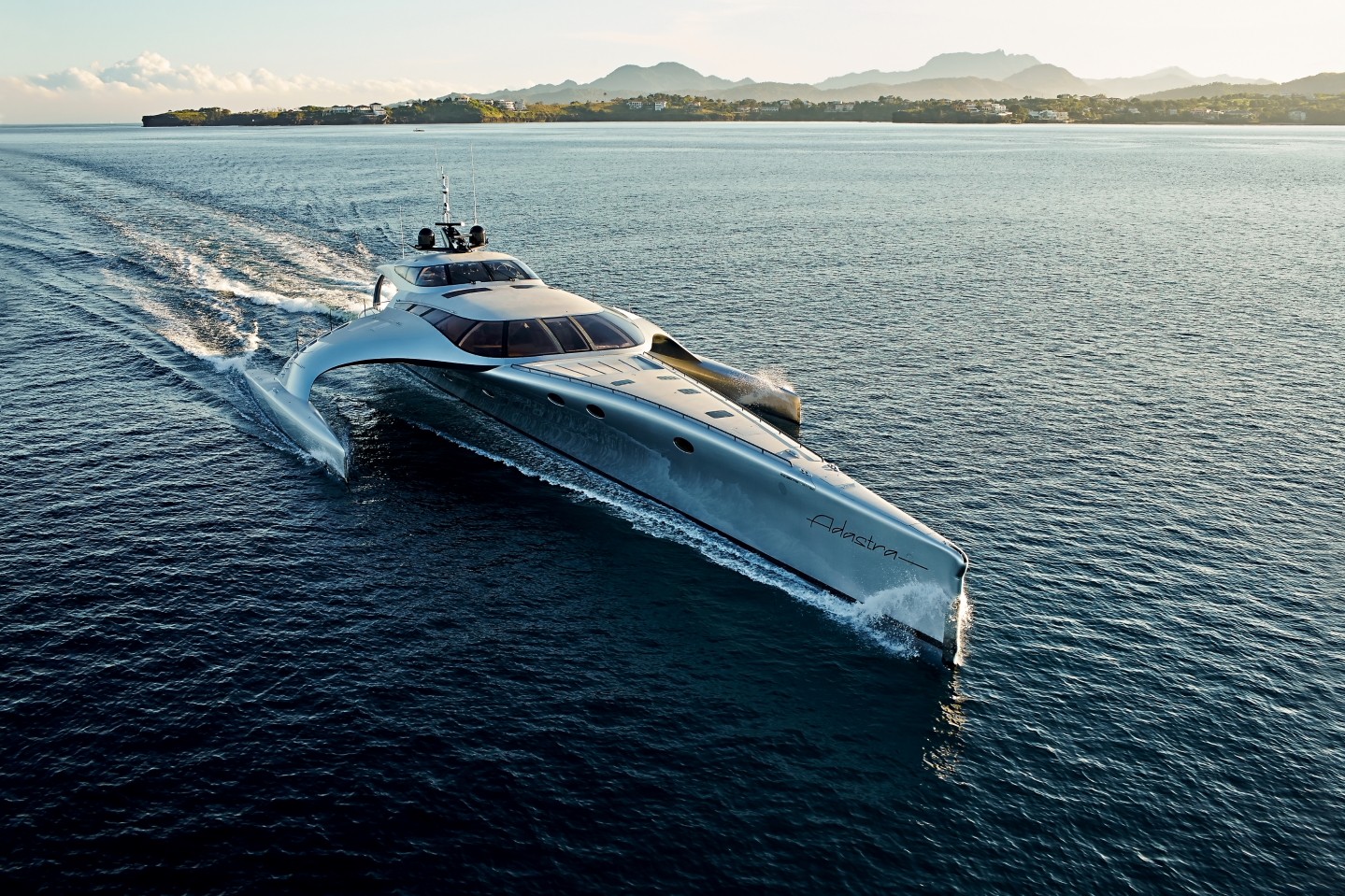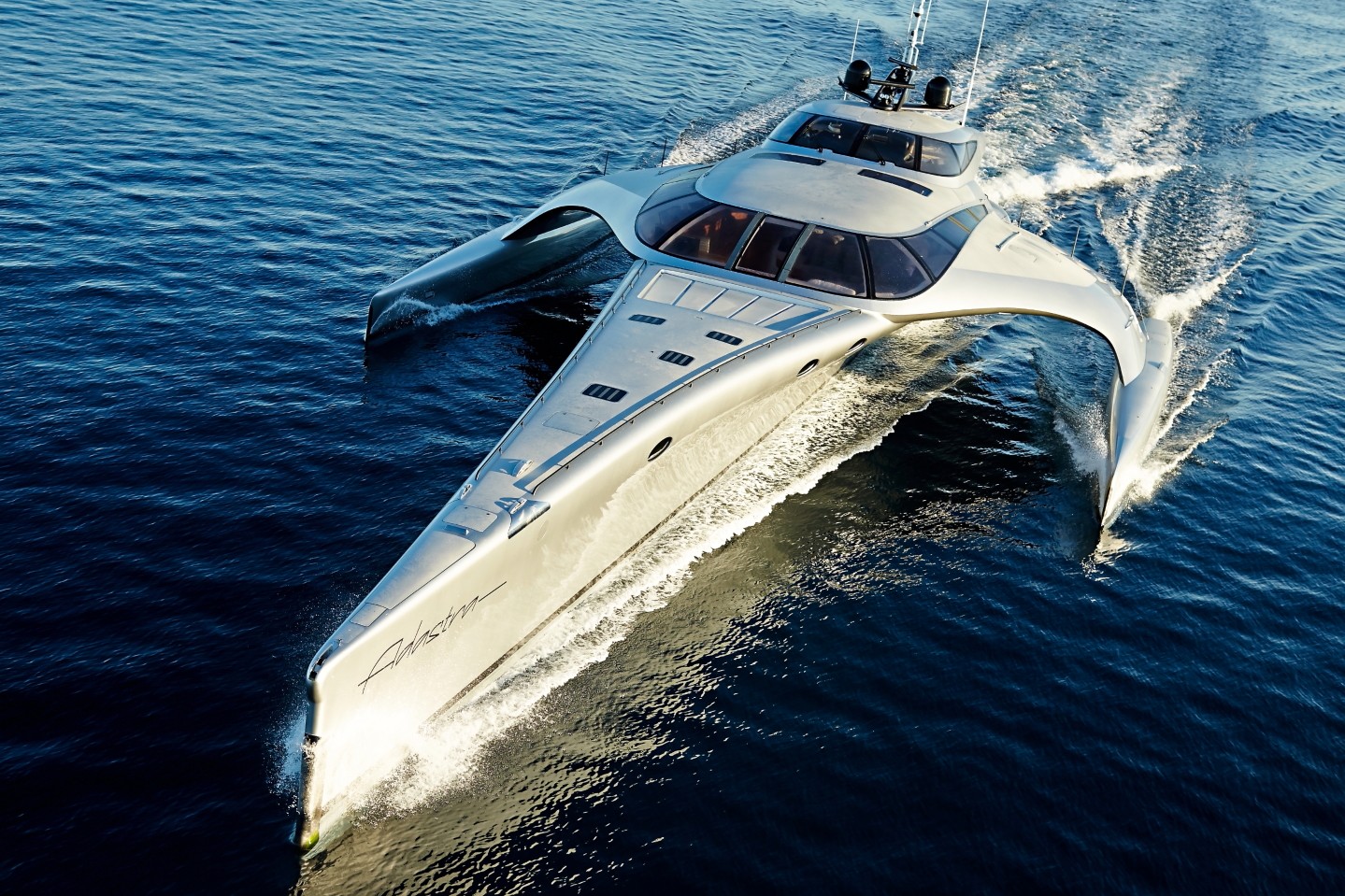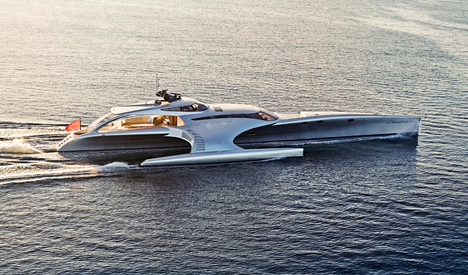 Adastra è un nome molto appropriato per un trimarano di 42,5 metri, un'imbarcazione che sembra appena atterrata dallo spazio ("Ad astra" è un'espressione latina che si traduce come "alle stelle").
