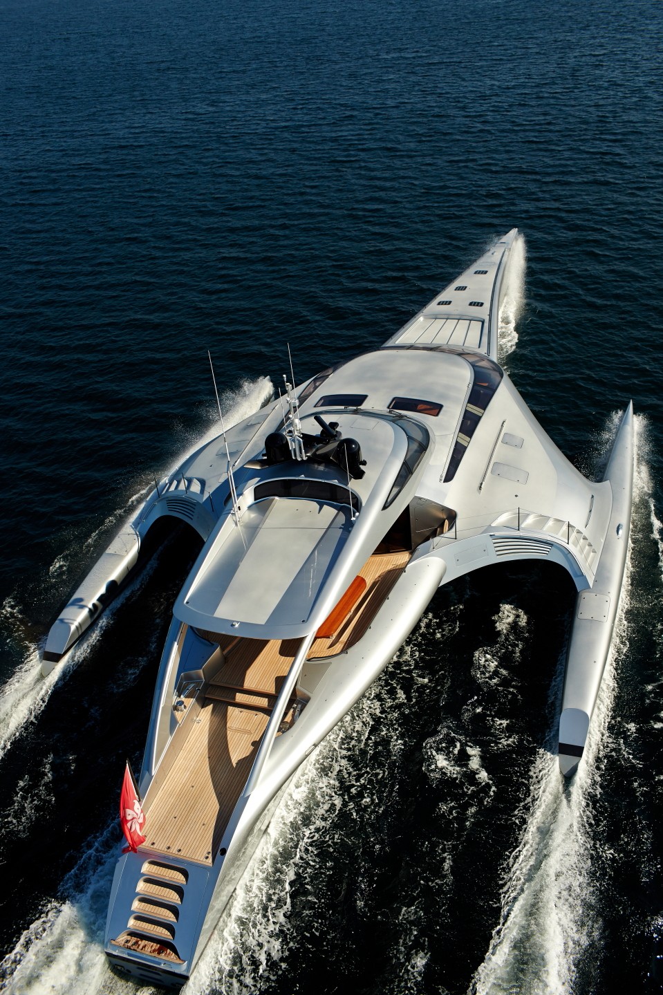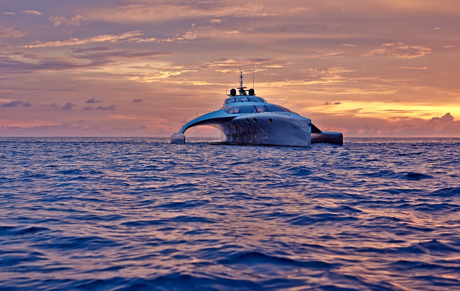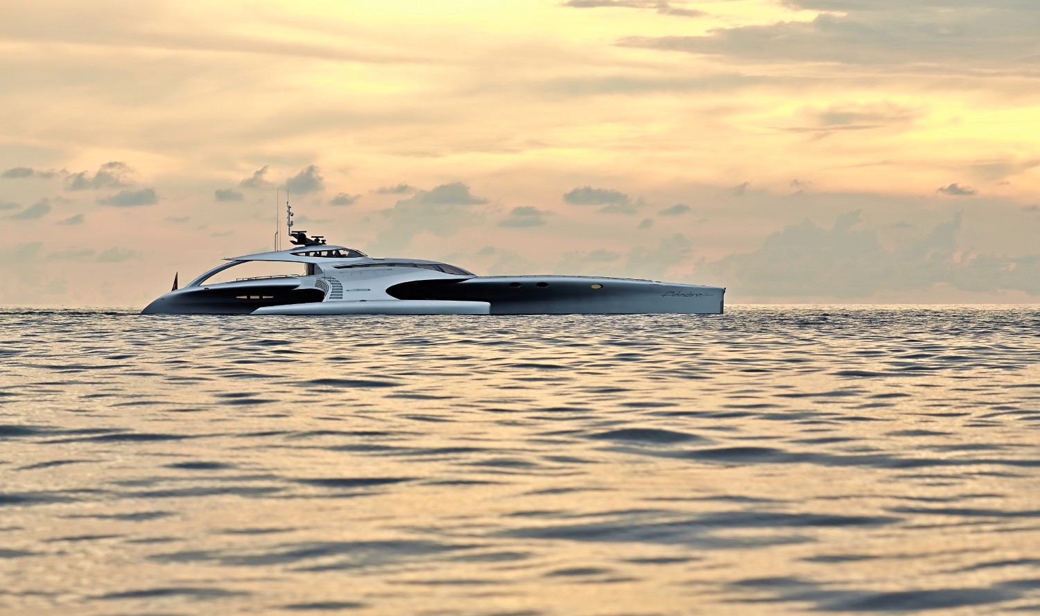 Adastra è un nome molto appropriato per un trimarano di 42,5 metri, un'imbarcazione che sembra appena atterrata dallo spazio ("Ad astra" è un'espressione latina che si traduce come "alle stelle").