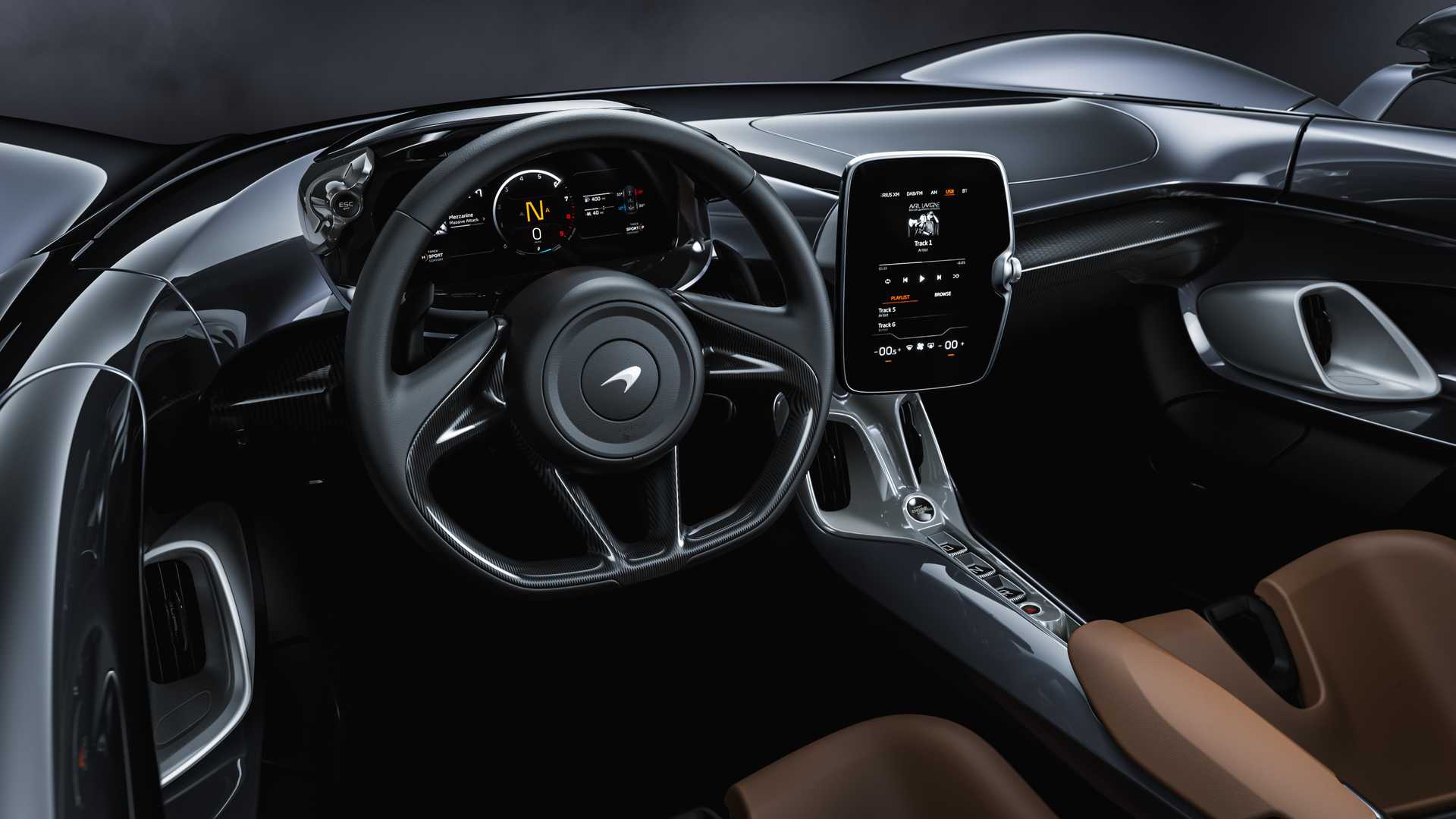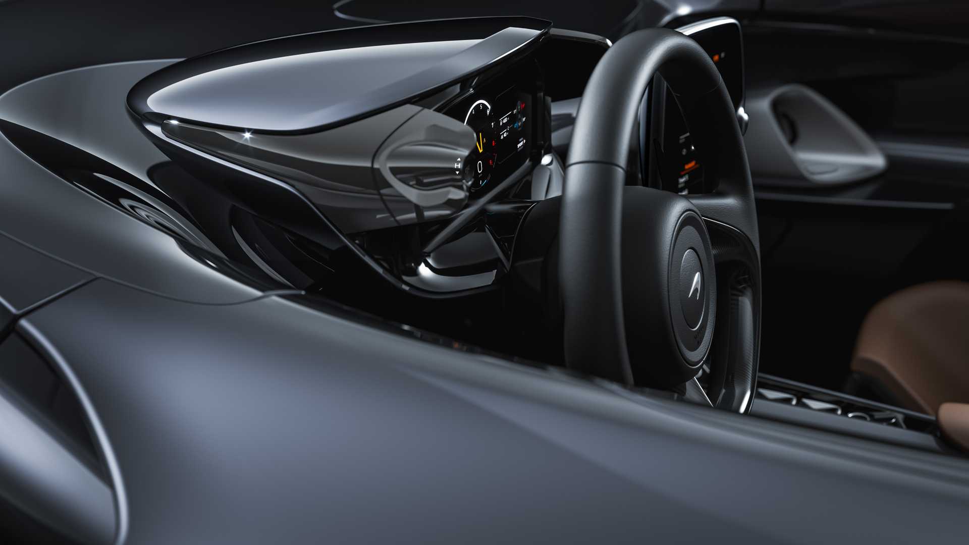 Gli interni della McLaren Elve con stile partite con l'esterno ed è soprattutto funzionale E pratico. Controlliamo le funzioni dell'auto tramite 8 pollici touch screen. Al posto del vano bagagli abbiamo a disposizione due comodi vani portaoggetti due caschi.