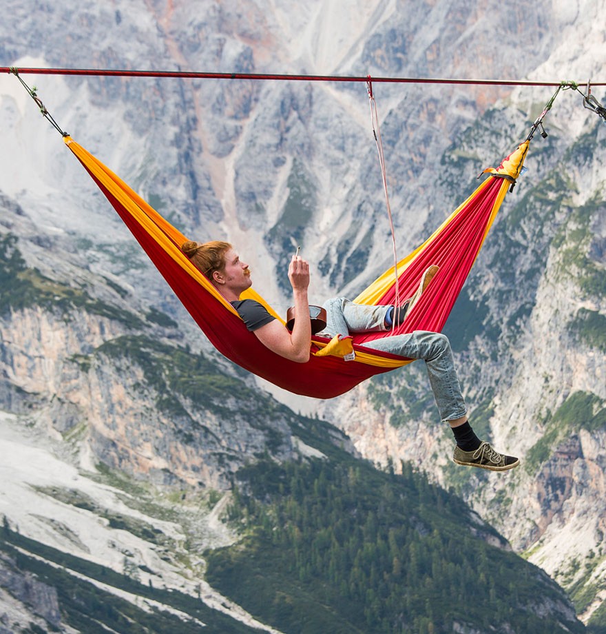 Za vse tiste, ki se bojijo višine, mednarodni Highline Meeting festival vsekakor ni. Obiskovalci le-tega so namreč razpeti med Dolomitskimi Alpami v italijanskem kraju Monte Piana in jim padec sto in več metrov niže preprečuje le amaca, ki se oklepa najlonske vrvi.