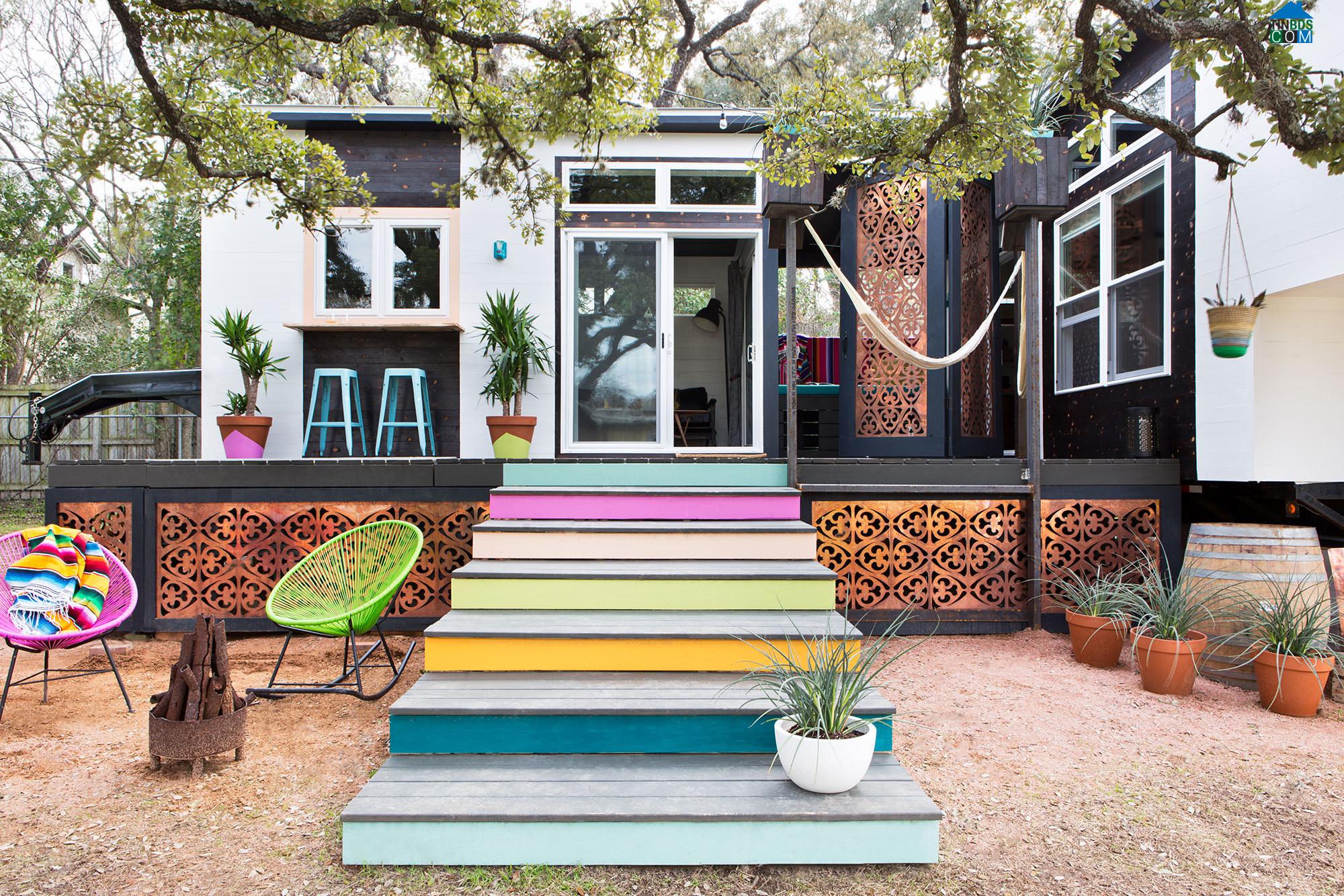 Eklektična mešanica dekorja ustvarja edinstven videz v tej drobni hiši na kolesih. Nevtralni kavč nevtralizira prostor in omogoča, da zasijejo rdeče okrasje in umetniška dela.