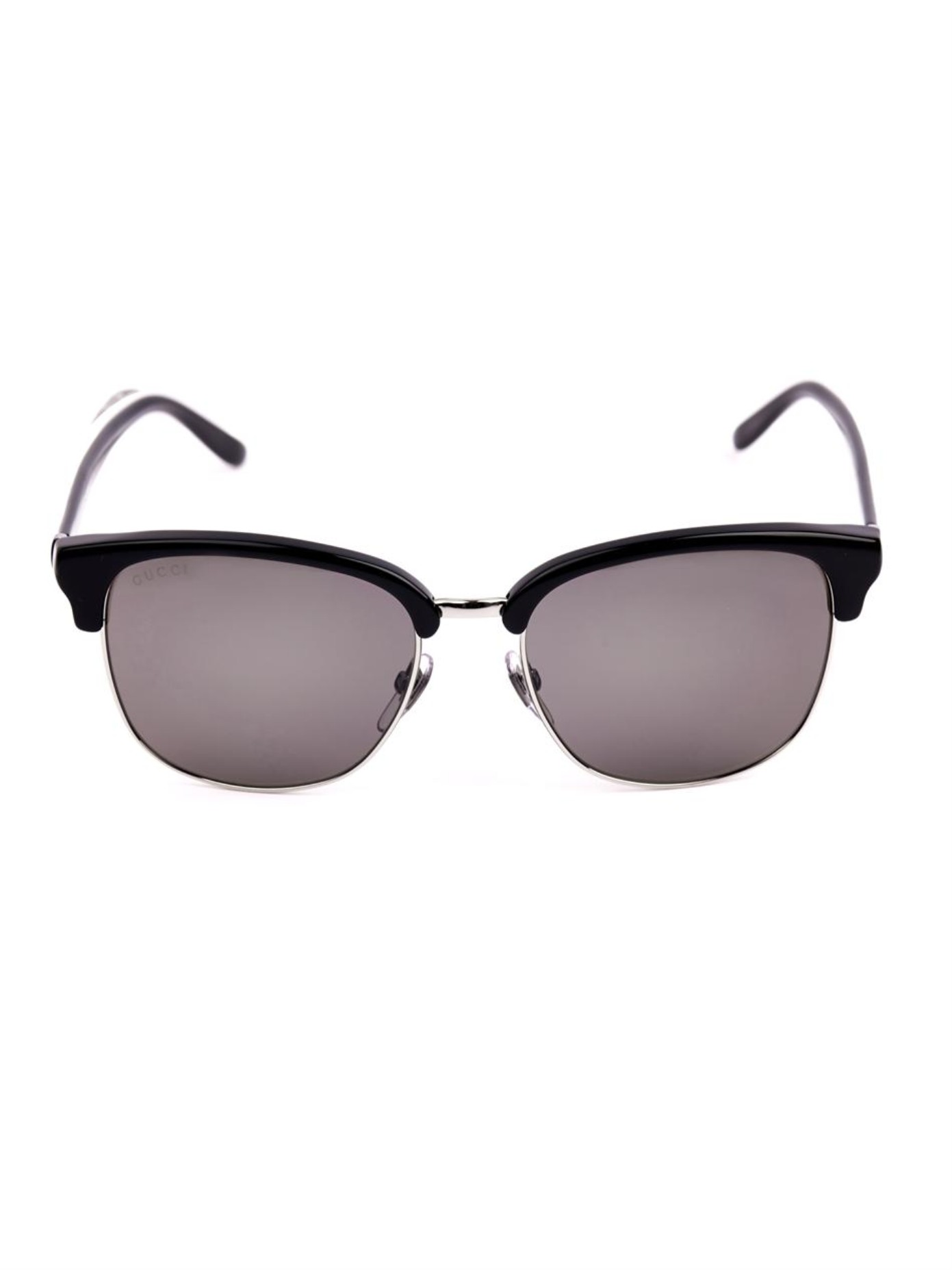 Oblika “D-frame” se ponovno vrača na sceno. To je skupaj s tankim okvirjem iz zlato obarvane kovine ter črnim delom nad lečo odlično zdužil Gucci. Sivo obarvane leče dajejo nekoliko milejši videz.