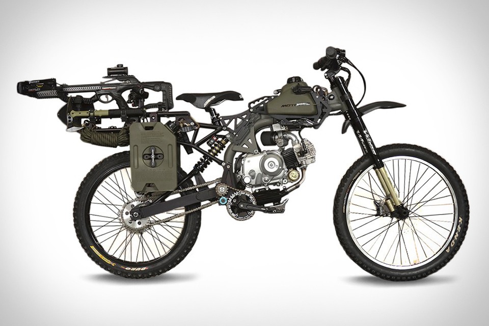 Motociclette simili destinate all'uso nelle condizioni di guida più difficili tendono ad offrire molte attrezzature, ma dimentica quanto sia difficile trasportare tutta questa attrezzatura. Questo non è un problema con un ciclomotore per la sopravvivenza, poiché è un misto di una mountain bike con miscele di motociclette da enduro e l'attrezzatura è composta da vari oggetti di scena per la sopravvivenza in natura.