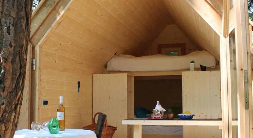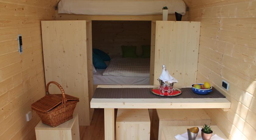Case che sono tutto coibentato e riscaldato (quindi visitabile tutto l'anno, anche nel periodo invernale), può ospitare fino a quattro persone, e sono dotate di poltrone, letto a castello matrimoniale, TV via cavo, Wi-Fi, armadi e sgabelli, e sulla terrazza possiamo trovare vasca da bagno a legna e un tavolo con sedie. Inoltre, è a disposizione degli ospiti bagno privato con doccia e servizi igienici (separati dalla casa), e tra gli spazi comuni ci sono quelli interni sauna con doccia, zona relax con sdraio, sala massaggi esterna e focolare comune. E' a disposizione anche degli ospiti hatha yoga e guaritore. L'offerta è completata da un'offerta culinaria, ovvero mattina e sera cestino con piatti sloveni, che viene consegnato agli ospiti sulla terrazza (hanno qualcosa di simile anche al Camping Bled). Il menù à la carte viene offerto nel ristorante dell'hotel, non lontano.