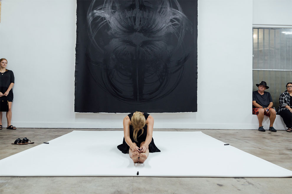 Heather Hansen è strast do plesa in likovne umetnosti zlila v eno. Namesto klasičnega pristopa k sliki tako na platno, ki je njeno plesišče, ročne poteze s čopičem nadomešča s plesno koreografijo.