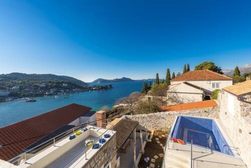 La splendida e lussuosa Villa Baburizza è una casa in pietra di 400 anni ristrutturata situata accanto a una chiesa del XIV secolo nella parte superiore del villaggio di Donje Čelo sull'isola di Koločep. Questa bellissima villa si sviluppa su due piani. È arredato e decorato nel gusto mediterraneo dei colori blu e bianco come riflesso del mare, del cielo e della pietra in un mix unico di tradizionale e moderno. Vanta una splendida vista panoramica del tramonto sulla baia, sull'isola di Lopud e oltre. La villa comprende tre camere da letto, una cucina completamente attrezzata con una spaziosa sala da pranzo e un soggiorno. C'è un giardino recintato con mobili da giardino, un tavolo da pranzo e un barbecue. Dal giardino e dalle camere da letto si accede alla terrazza solarium e alla piscina con getti idromassaggio, da dove si può godere di una meravigliosa vista sul mare o di tramonti mozzafiato.