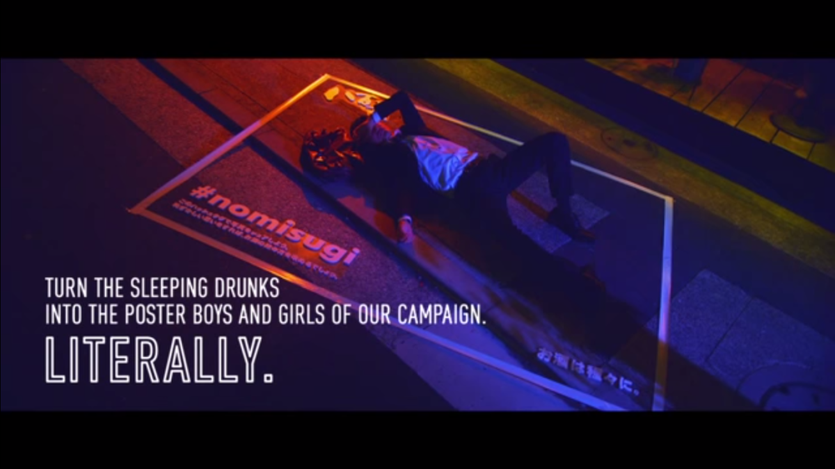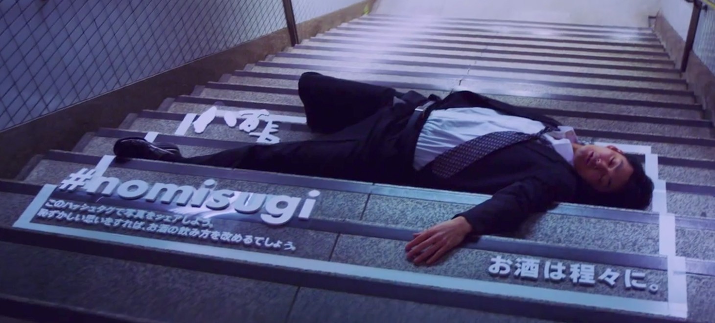 Anche se l'onore e il rispetto significano molto in Giappone, sorprendentemente per i giapponesi l'ubriachezza non è affatto un problema e, per attirare l'attenzione su questo fenomeno, le agenzie Ogilvy e Mather E Geometria globale per un cliente, uno dei più grandi bar giapponesi Yaocho, hanno preso la situazione nelle loro mani creative e hanno trasformato gli ubriachi che dormivano per strada in "star" di manifesti giganti: li hanno circondati con una cornice bianca e un'etichetta #NOMISUGI (troppo ubriachi in giapponese) e invitava così i passanti a fotografarli e condividerli sui social network.