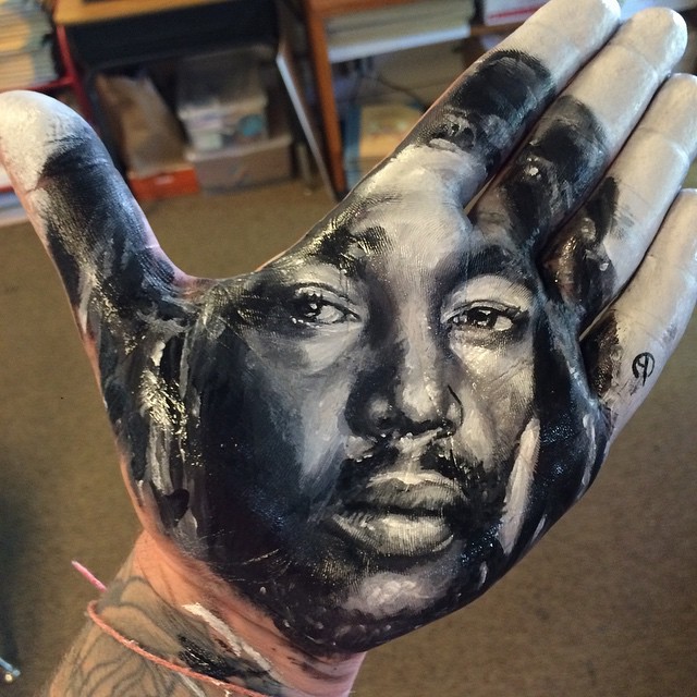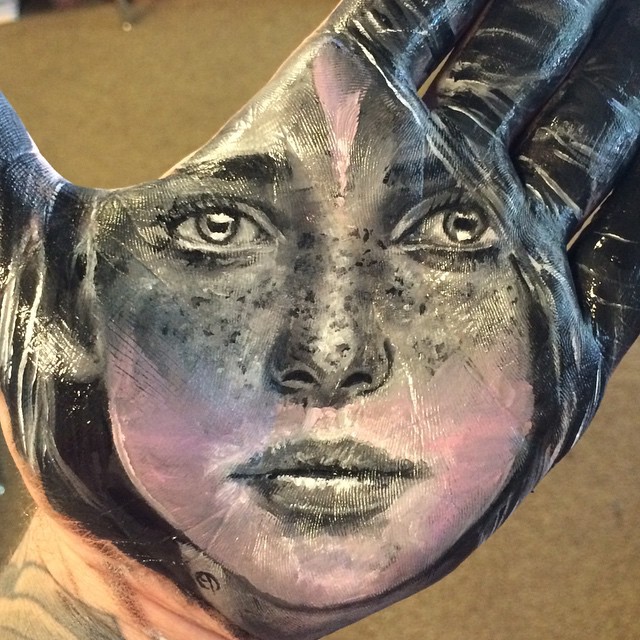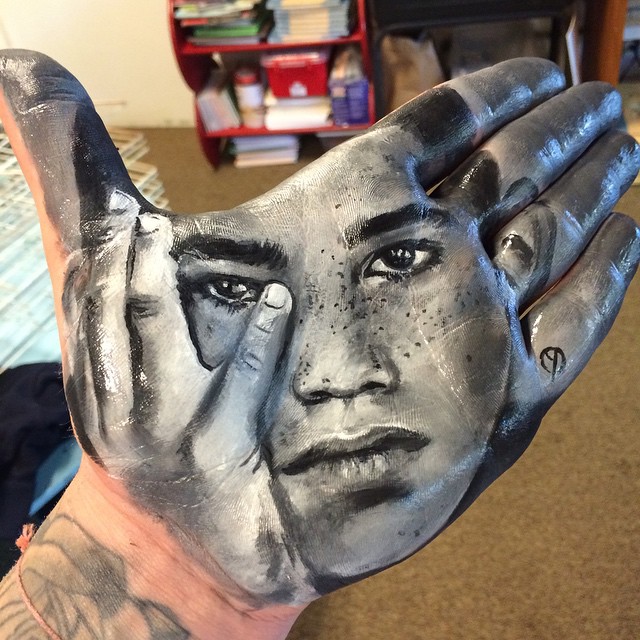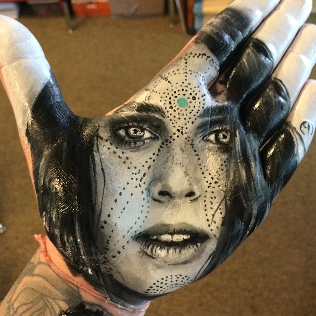 Ma perché dovresti disegnare tali opere d'arte sulla tua mano, solo per poi doverle lavare via? Bene, Powell si assicura che il suo lavoro non sia vano o solo temporaneo, poiché, quando la vernice è ancora fresca (indicando che deve essere veloce nel suo lavoro), ritratto come un francobollo, lo stampa su un foglio di carta, e le sue impronte digitali ci ricordano come è stato effettivamente realizzato il dipinto. Impressionante!