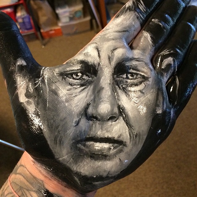 Molte opere d'arte mozzafiato sono create da mani umane. Inoltre, sulle mani vengono create opere d'arte che rivaleggiano con quelle sulle tele. Uno che rientra in questa seconda categoria di artisti è Russell Powell, ma non fa tatuaggi, come potresti pensare a prima vista. Powell disegna ritratti incredibilmente realistici con la propria mano, o meglio con il palmo della mano. Ma le sue foto non restano solo in mano, perché le stampa su carta come un francobollo.