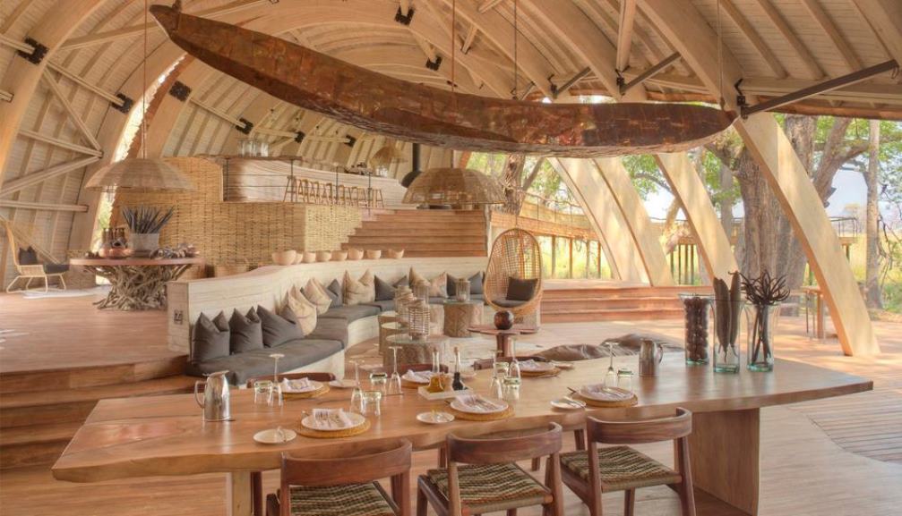 Il safari lodge Okavango di Sandiba ci dimostra che anche la costruzione ecologica con materiali biodegradabili e sostenibili può essere lussuosa. La residenza è costruita quasi interamente in legno e ricorda una barca rovesciata con travi curve di pino.