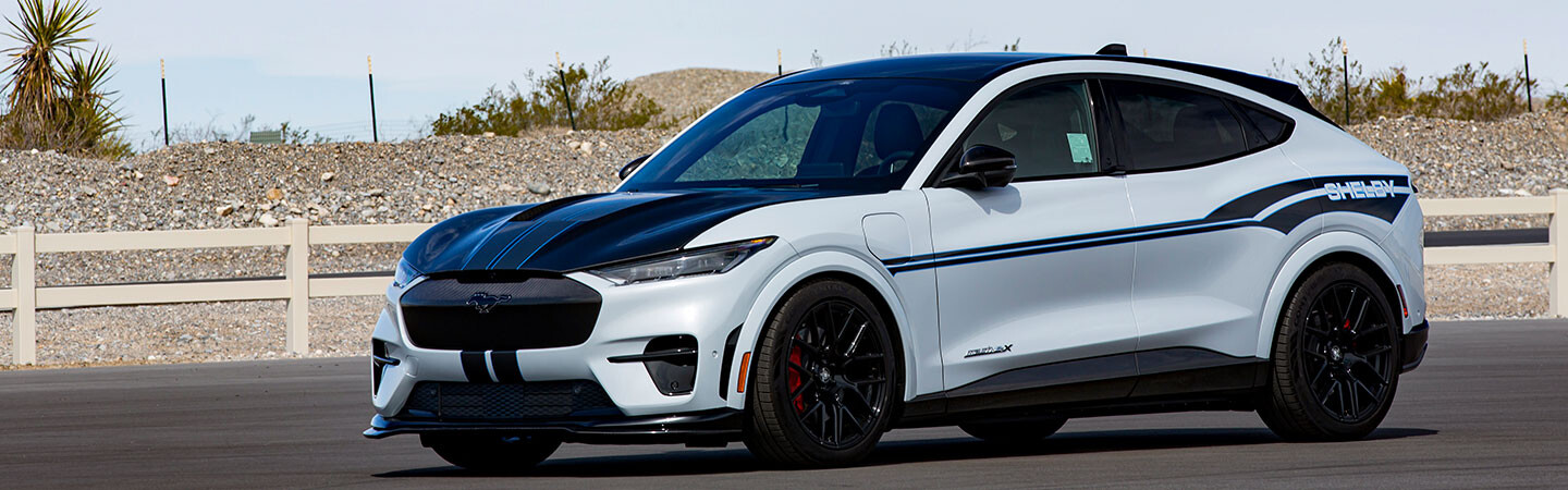 Questo crossover elettrico con trazione integrale, in base al modello Ford Mustang Mach-E GT, vanta impressionante 480 cavalli. Il pacchetto Shelby fa un ulteriore passo avanti migliorando la maneggevolezza e lo stile del SUV. Il veicolo è stato ribassato di un pollice (2,54 cm) e alleggerito, grazie all'utilizzo di componenti in fibra di carbonio e ruote più leggere. La riduzione di peso deriva dal cofano in fibra di carbonio, dallo splitter inferiore anteriore, dalla fascia anteriore, dalle calotte degli specchietti e dai rivestimenti inferiori delle portiere.