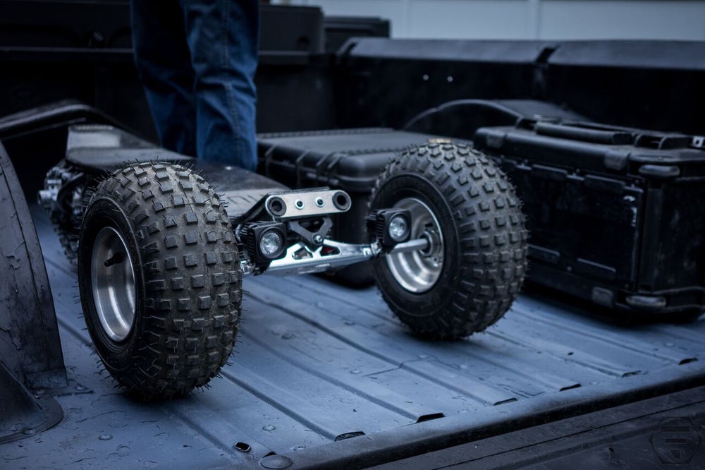 Flux Design Co. è la società responsabile della realizzazione del consiglio di amministrazione Traccia 1. Si tratta di una combinazione di materiali leggeri come Kevlar E fibra di carbonio, su cui montarono robuste ruote da fuoristrada e cingoli da carro armato. Il motore nello skateboard ha 5 cavalli e raggiunge velocità fino a 32 chilometri all'ora.