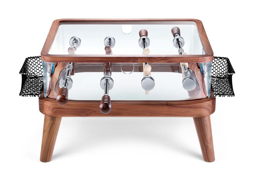Il biliardino Intervallo Teckell è un tavolino da calcio con le mani, più piccolo di quelli a cui siamo abituati dai bar, poiché ha due maniglie e solo tre giocatori su ciascun lato. È realizzato in cristallo e circondato da legno, mentre la parte superiore è removibile, permette l'accesso al gioco e può essere utilizzata anche come vassoio da portata.