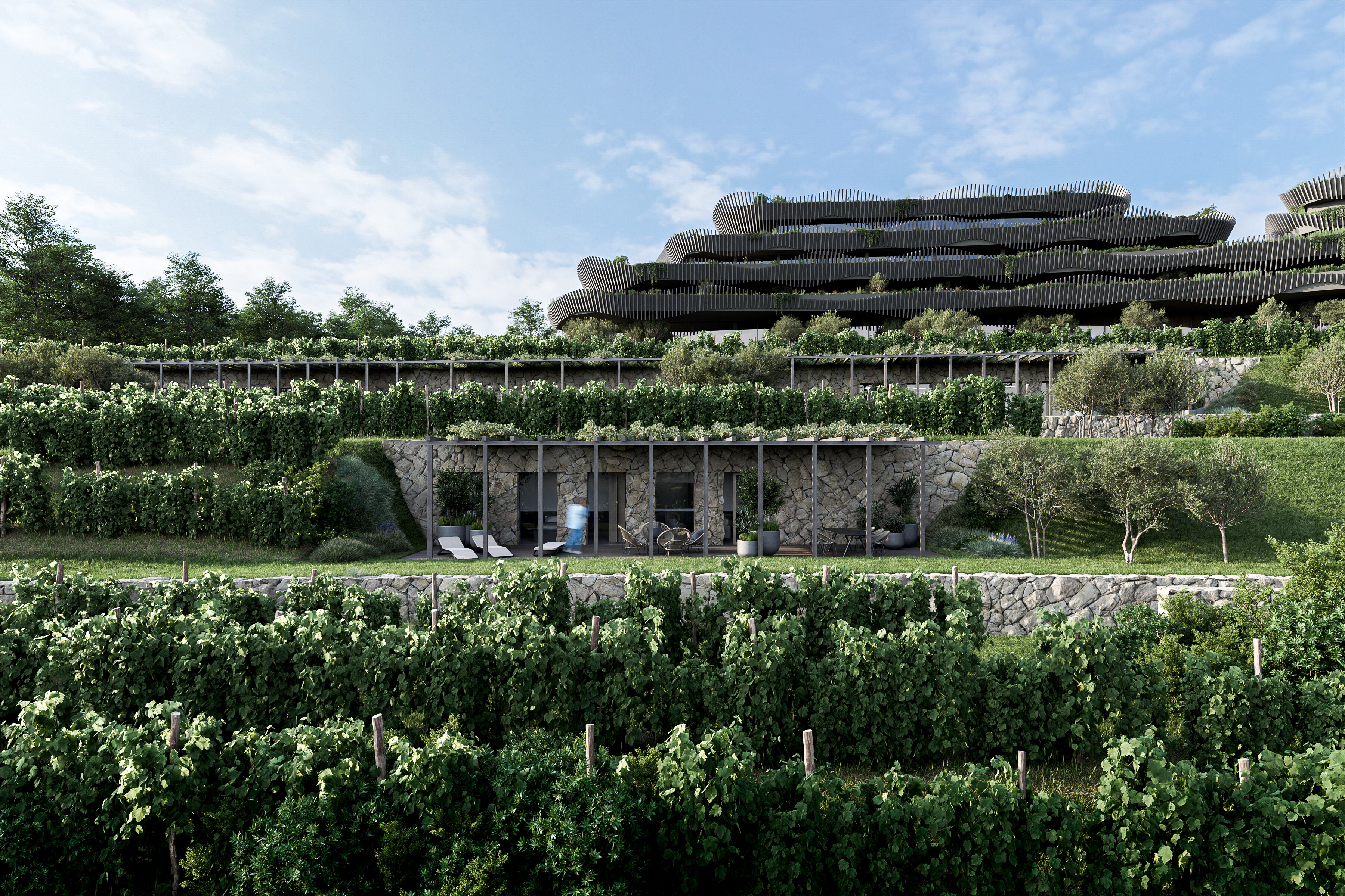Il progetto architettonico del progetto è firmato dal rinomato studio di architettura SoNo arhitekti, e sono stati guidati dalla configurazione del terreno esistente. La posizione scelta è circondata da vigneti terrazzati, che si riflettono anche sulla facciata dell'edificio progettato.