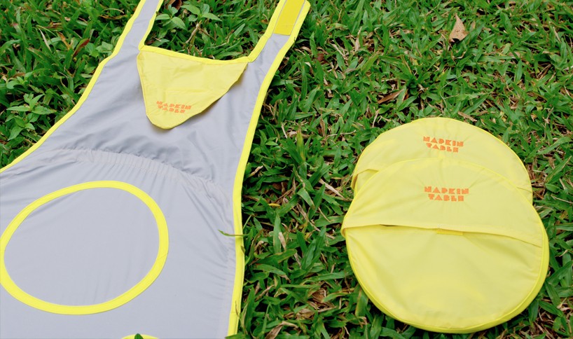 Il tavolo per due è realizzato in tessuto impermeabile e può essere appendere al collo. Ha un portapiatti e un portabicchieri. Come funziona in pratica lo potete vedere nei due video qui sopra.