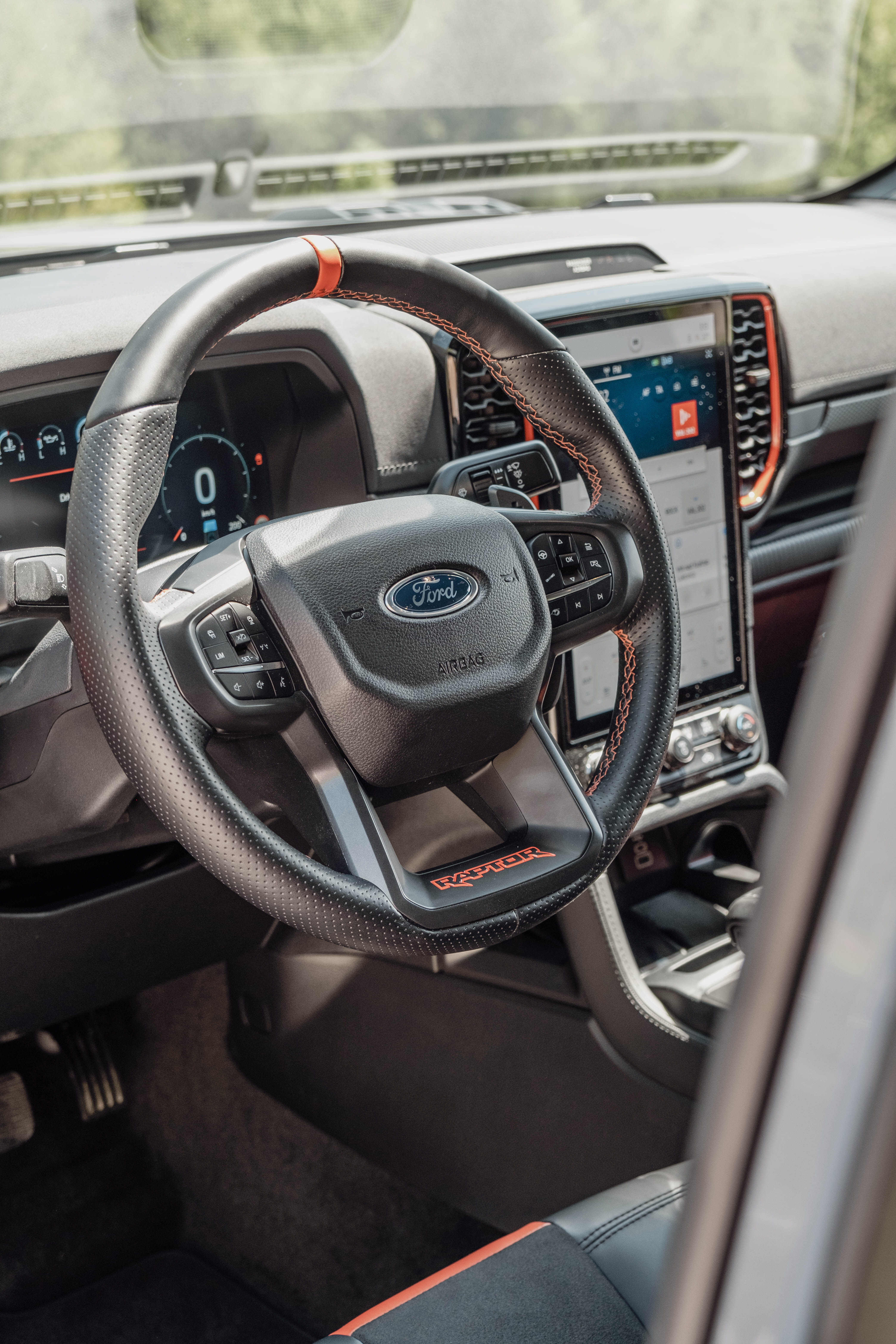 All'interno dell'abitacolo del Ranger Raptor ci sono nuovissimi sedili sportivi ispirati ai jet da combattimento che offrono maggiore comfort e supporto durante le curve veloci. Con l'arancione, per me rosso, gli accenti e l'illuminazione ambientale, l'interno emana una vivace atmosfera fuoristrada.