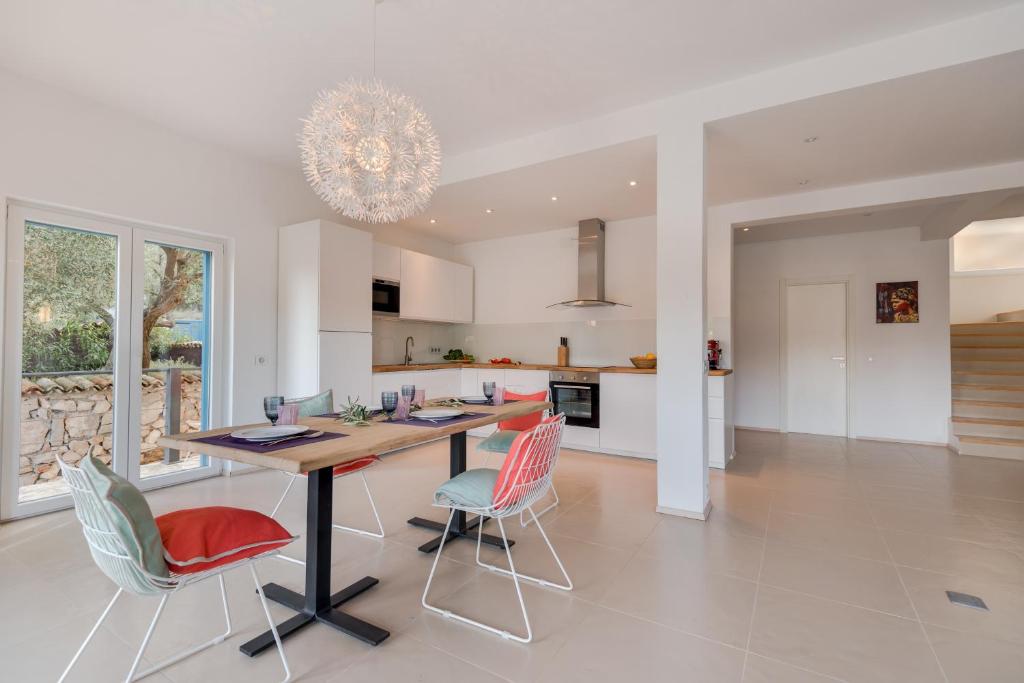 Può ospitare comodamente fino a dieci persone, poiché a disposizione degli ospiti ci sono cinque camere elegantemente arredate, quattro delle quali dotate di balcone. Al piano terra troverai una cucina moderna, una sala da pranzo e un soggiorno ben arredato, dove puoi navigare su Netflix o giocare a giochi da tavolo nella calura estiva. Oltre ai soggiorni, c'è anche una camera da letto al piano terra e altre quattro si trovano al primo piano.