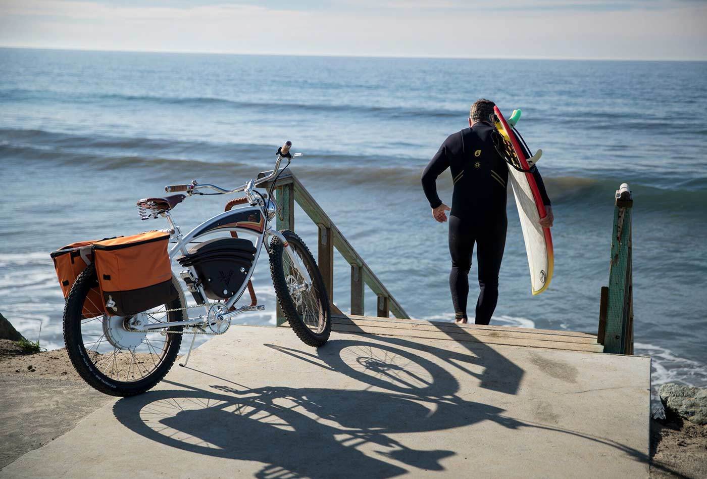 La bici elettrica Signature Cruz è stata creata dalla società californiana Vintage Electrics, che ha invitato al progetto la leggenda del "cavalcare" le onde Jeff Clark. Il look retrò e la trazione elettrica sono la giusta combinazione per una spensierata "crociera" su spiagge sabbiose.